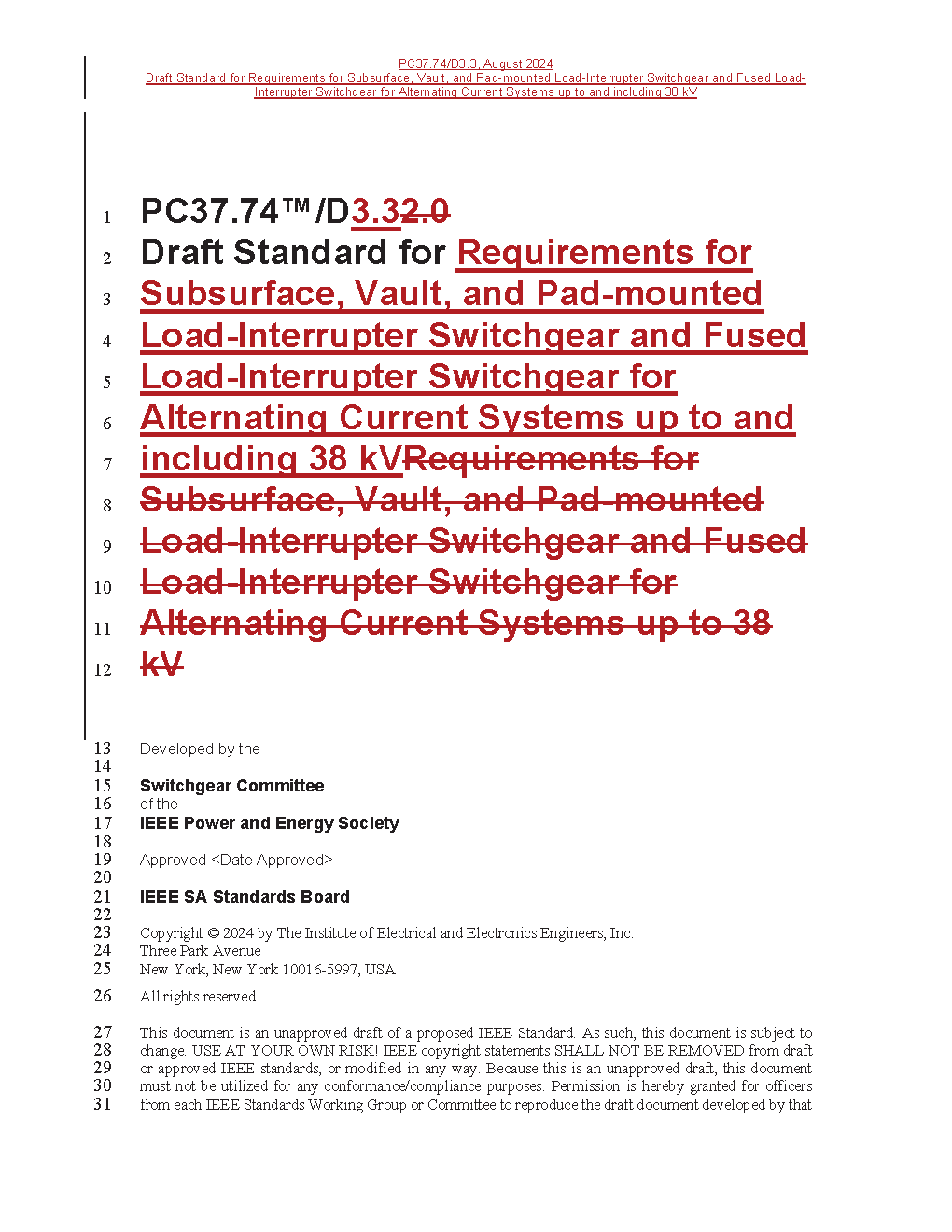 This standard applies to enclosed assemblies of single-phase and three-phase, dead-front and live-front, subsurface, vault, and pad-mounted load-interrupter switches with or without protective devices, such as fuses or fault interrupters, up to 38 kV rated maximum voltage.