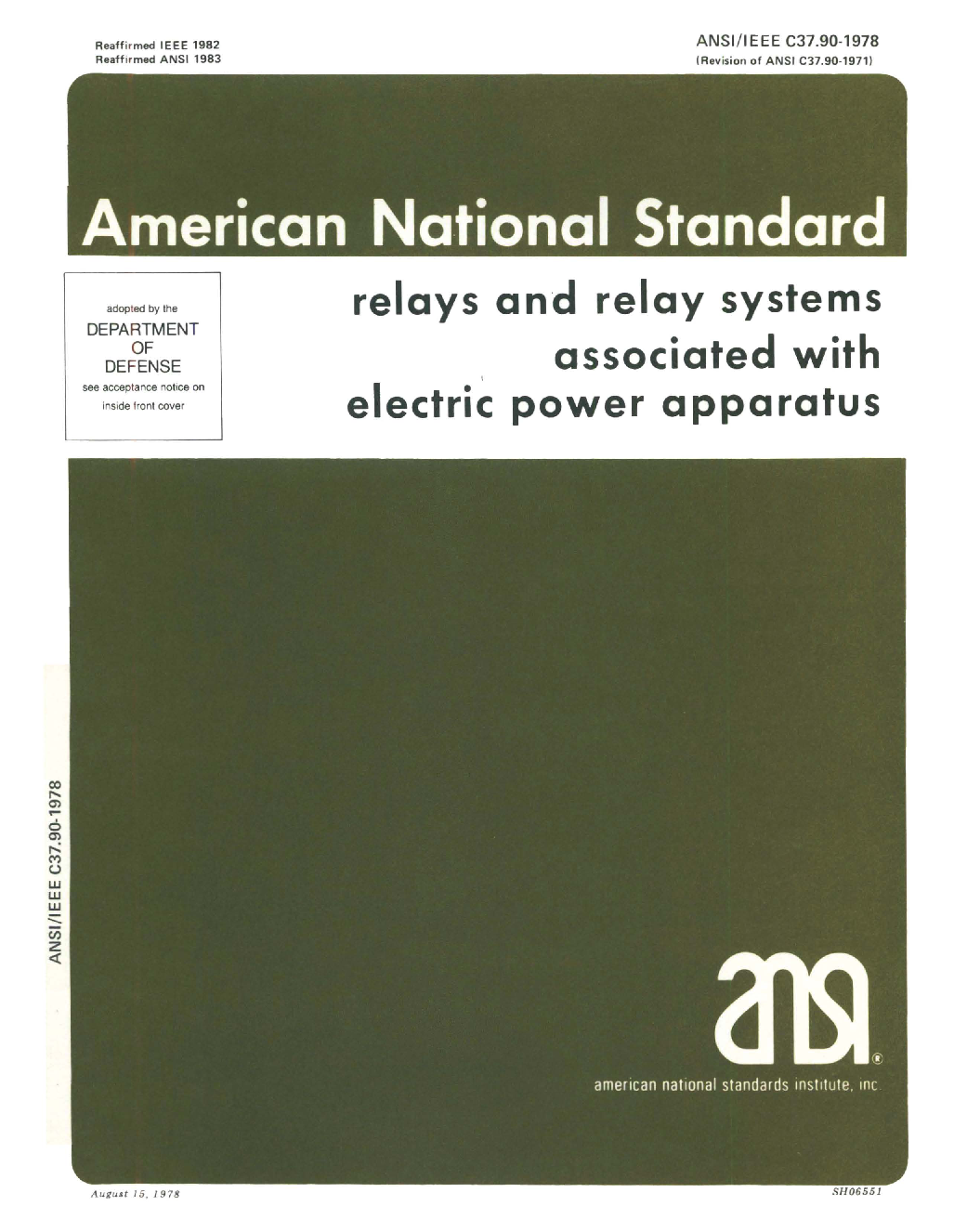 Superseded by IEEE Std C37.90-2005. This standard applies to relay systems that protect and control apparatus that generate, and distribute and use electric power. This standard defines service conditions and specifies relay performance requirements and performance information that relay manufacturers shall provide.
