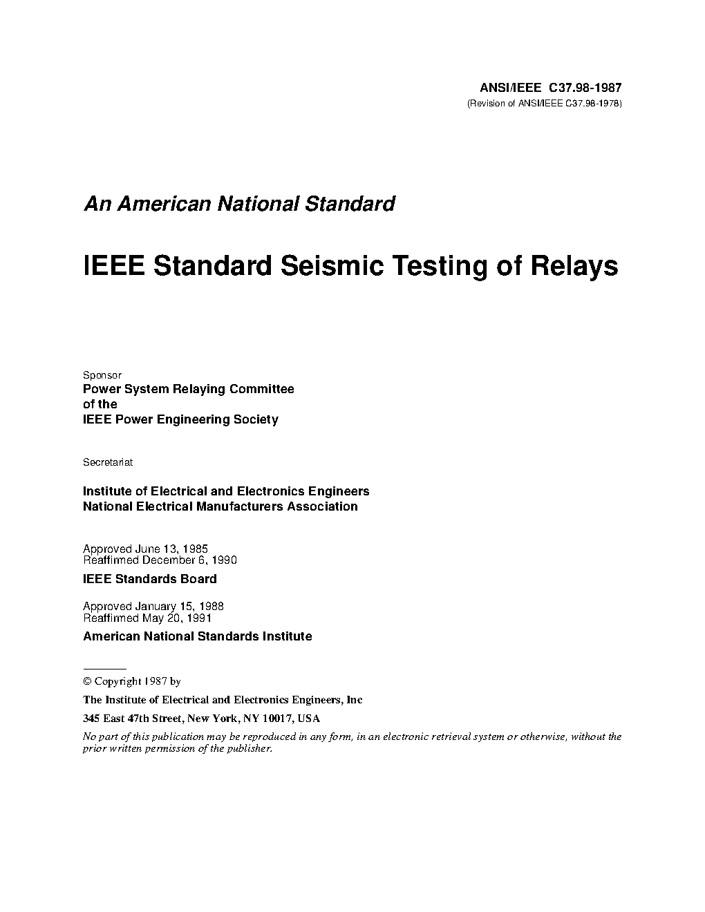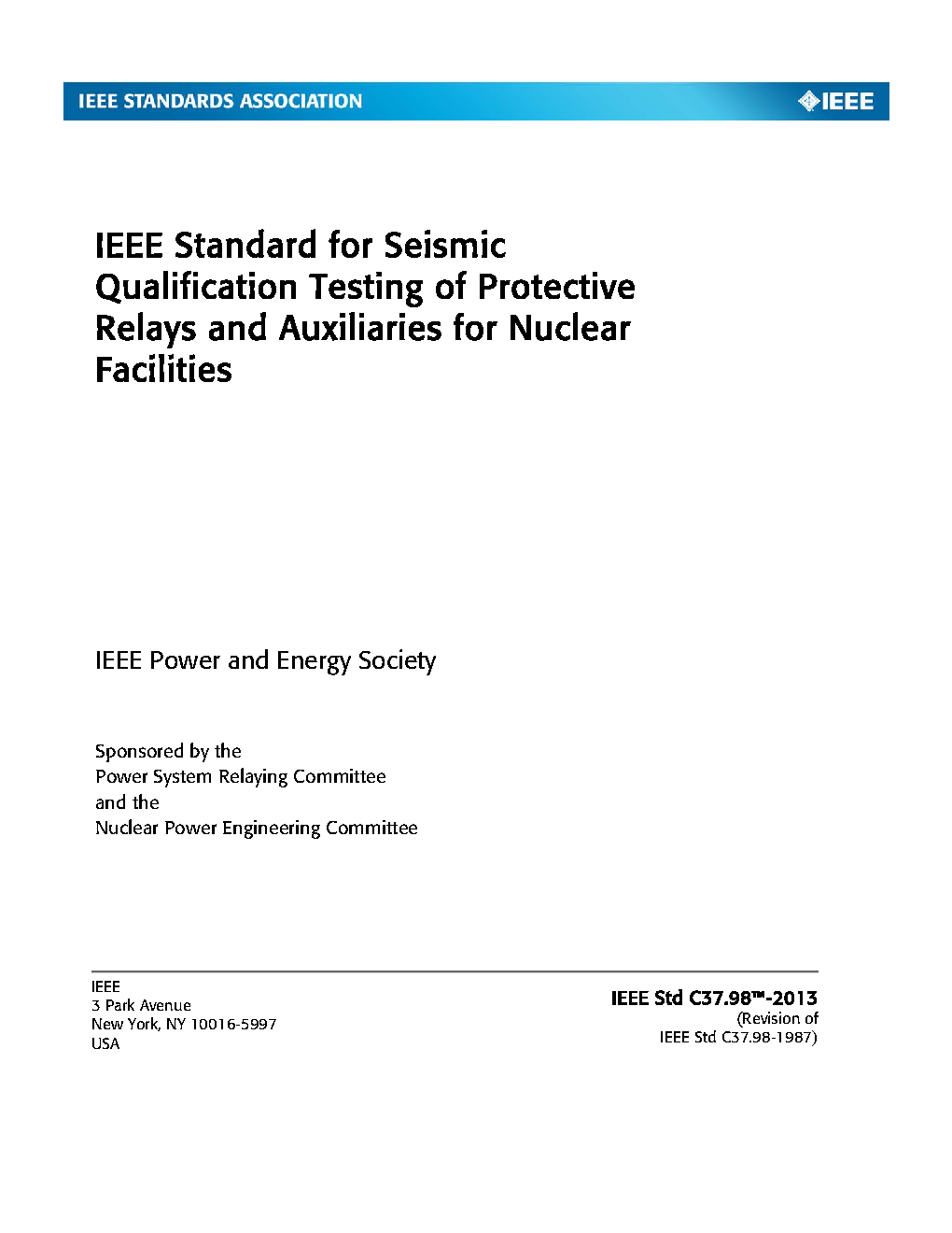 This standard provides guidance to establish the test parameters listed above, determine seismic capacity and to demonstrate the ability of protective relays and auxiliaries to perform their safety function during and or after the specified seismic motion. In addition, this standard provides the documentation requirements necessary to demonstrate seismic qualification of protective relays and auxiliaries.
