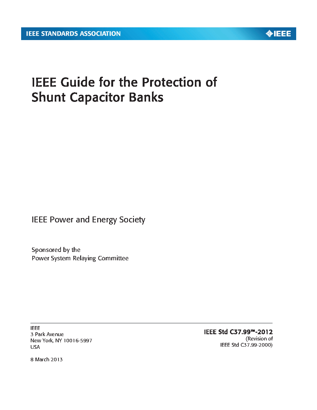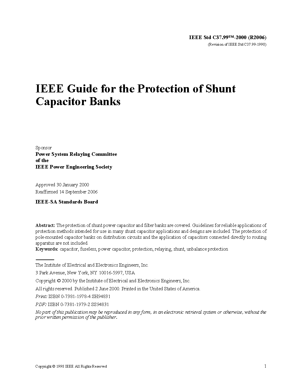 Superseded by C37.99-2000. This standard assists in the effective application of relays and other devices for the protection of shunt capacitors used in substations. It covers the protective considerations, along with recommended and alternate methods of protection for the most commonly used capacitor bank configurations. Capacitor bank design tradeoffs are also discussed. This guide covers protection of filter tanks and very large EHV capacitor banks, but does not include a discussion of pole-mounted capacitor banks on distribution circuits or application of capacitors connected to rotating apparatus.