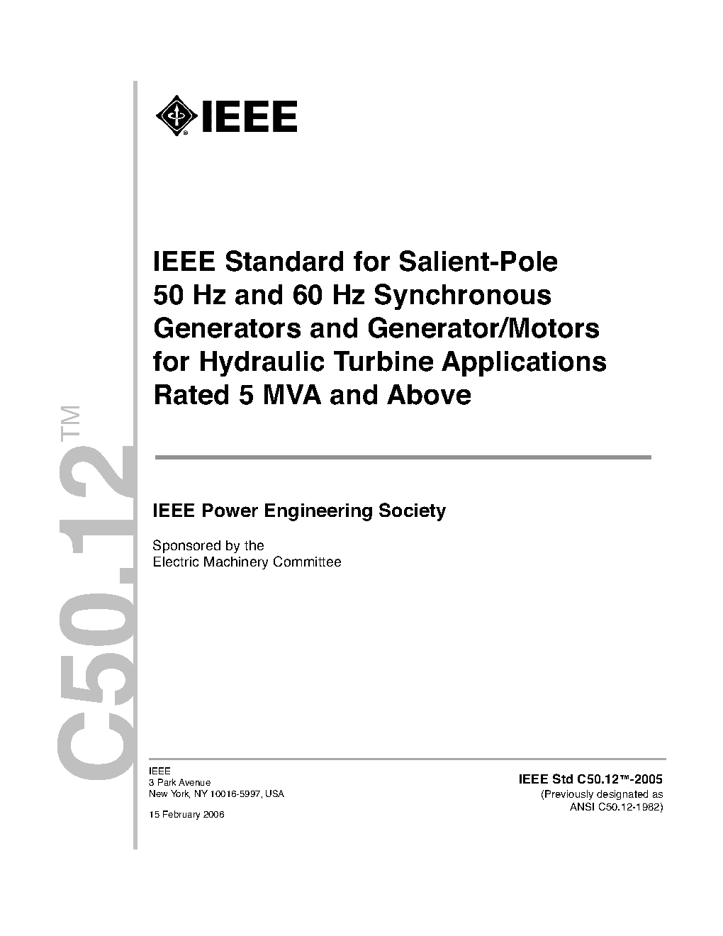 The requirements in this standard apply to all types of 50 Hz and 60 Hz salient-pole synchronous generators and generator/motors rated 5 MVA and above to be used for hydraulic turbine or hydraulic pump/turbine applications.