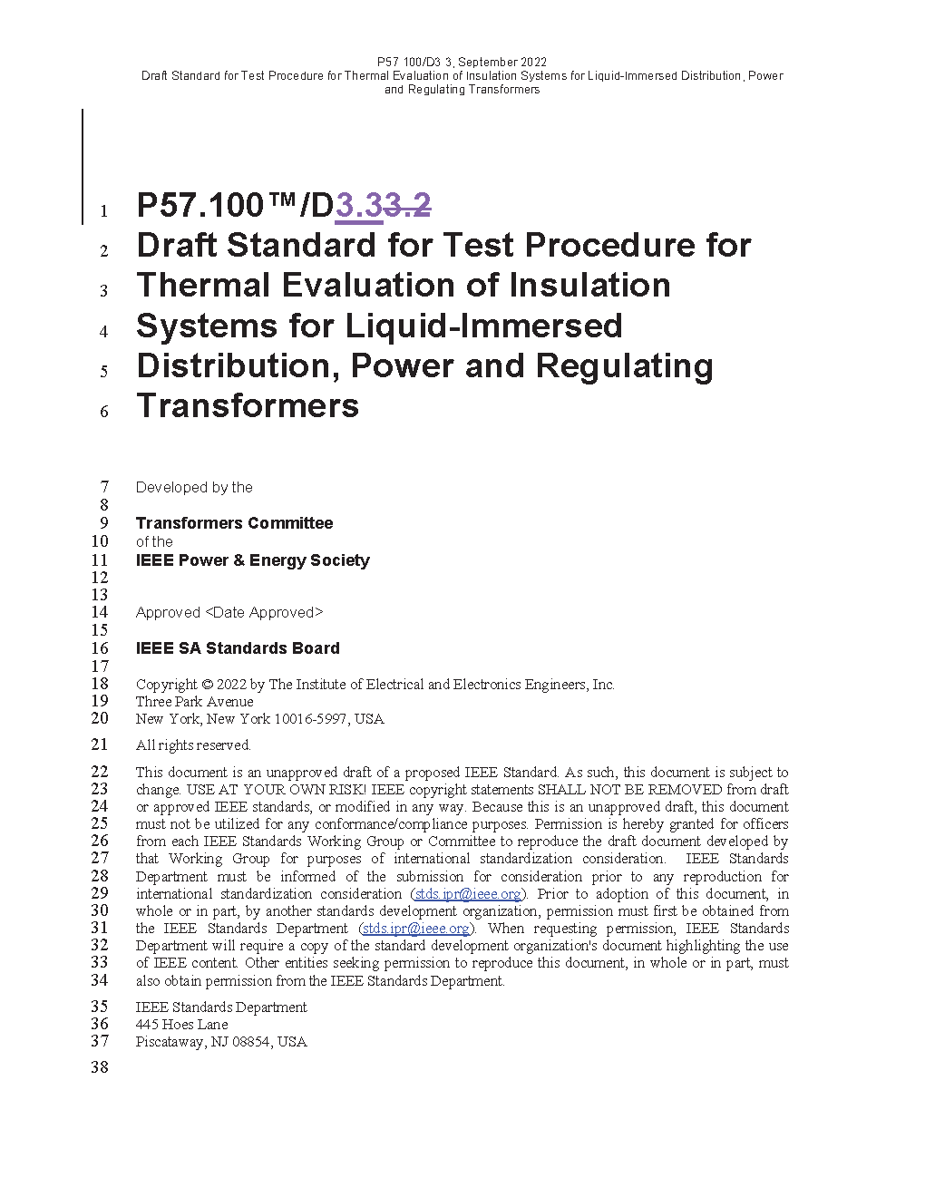 The object of this test procedure is to establish a uniform method for investigating the effect of operating temperature on the life expectancy of oil-immersed distribution transformers. The results may be used, for example, to: