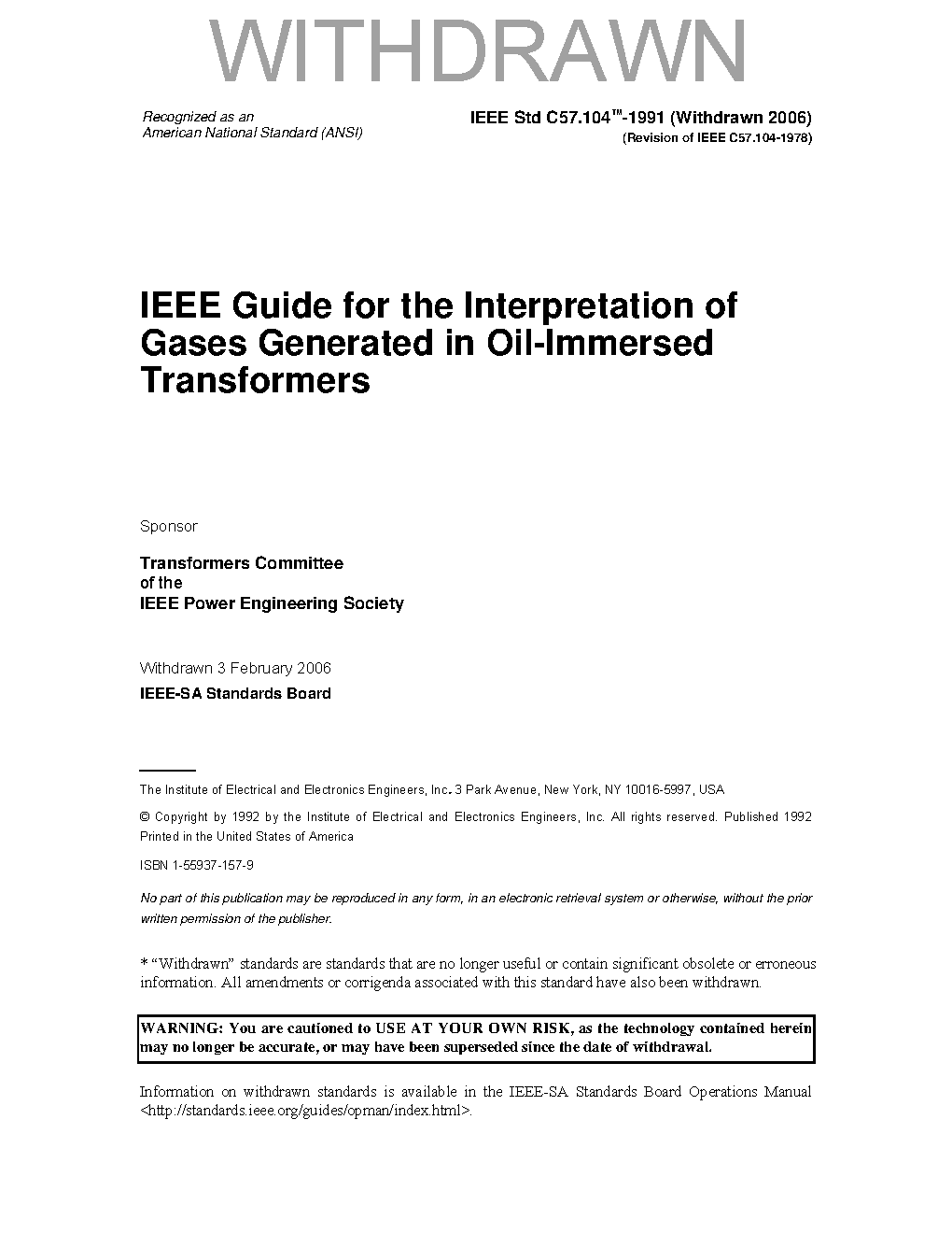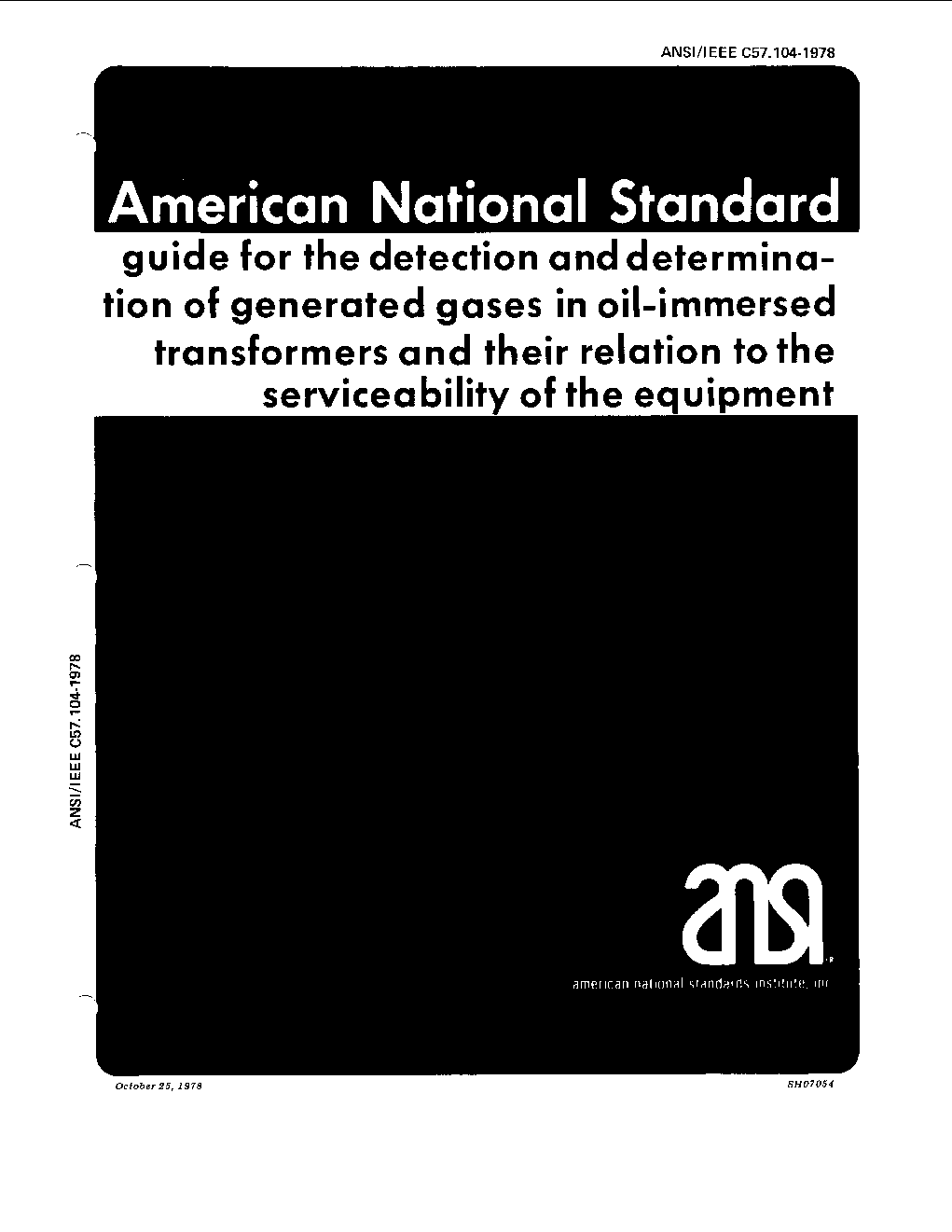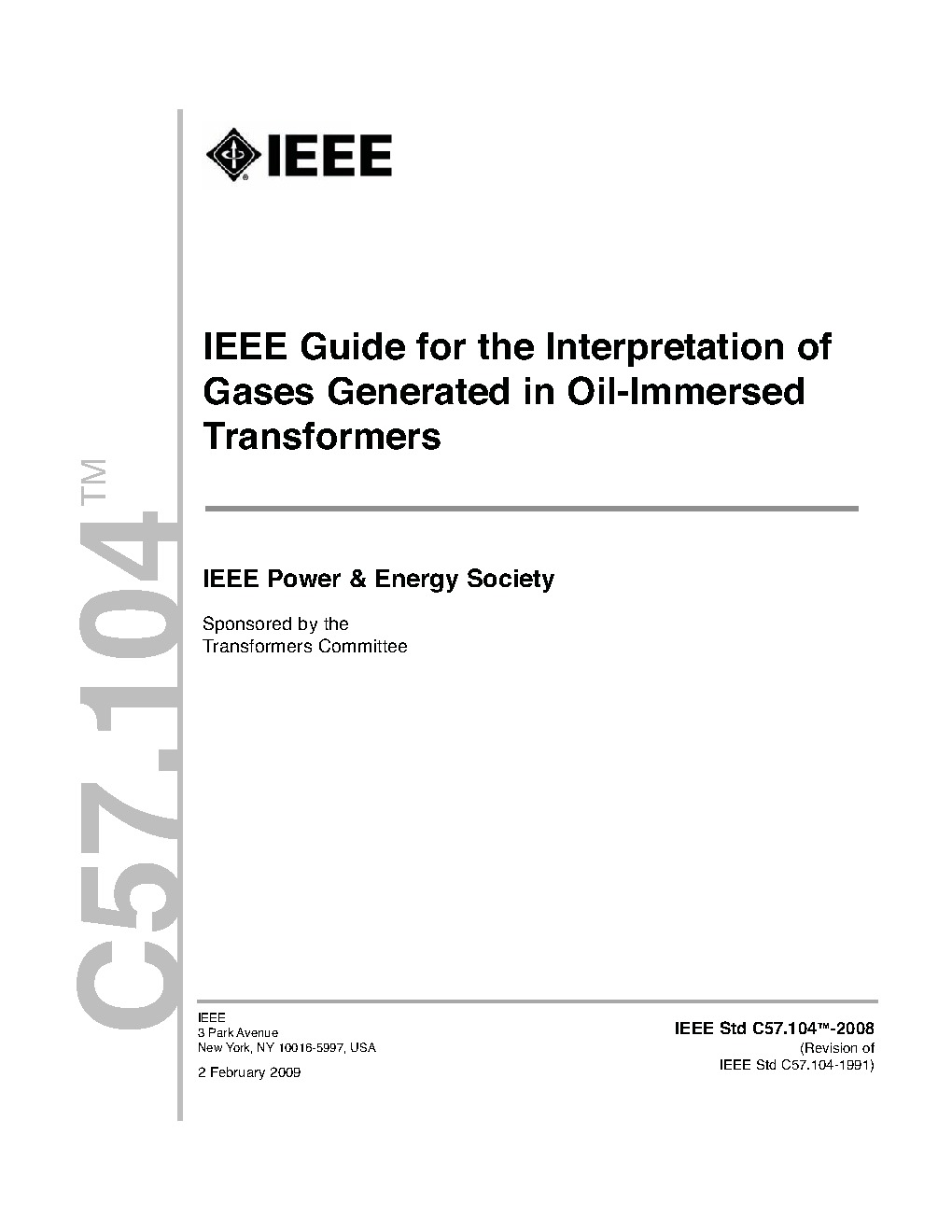 This guide applies to mineral oil-immersed transformers and addresses: a) The theory of combustible gas generation in a transformer b) The interpretation of gas analysis c) Suggested operating procedures d) Various diagnostic techniques, such as Key Gases, Rogers Ratios, Duval Triangle, and other methods e) Case studies and examples f) Evaluation criteria and guidelines g) A bibliography of related literature