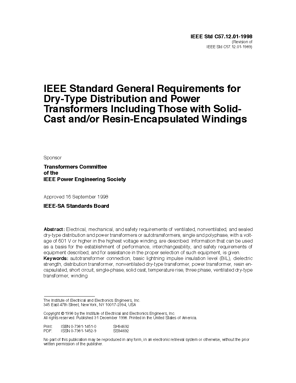 IEEE Standard General Requirements for Dry-Type Distribution and Power Transformers Including Those with Solid Cast and/or Resin Encapsulated Windings