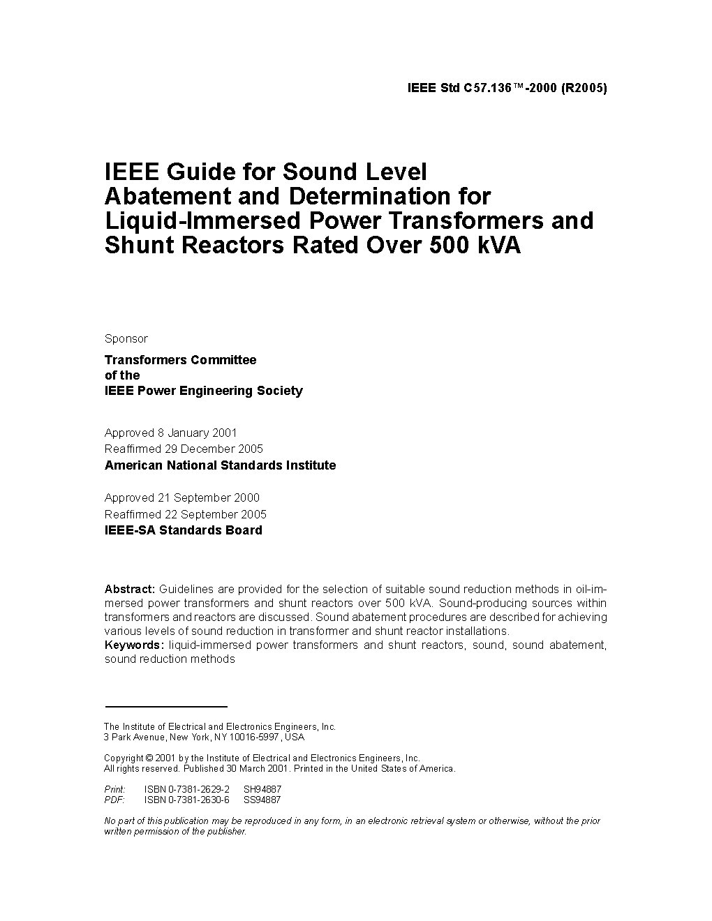 This guide supplements other IEEE documents related to sound levels of power transformers. IEEE Std C57.12.00™ defines sound levels and IEEE Std C57.12.90™ describes factory test procedures. The purpose of this guide is to provide practical information about sound level and reduction techniques to assist users and manufacturers in the proper specification, design, manufacturing, testing, and application of liquid-immersed power transformers. This guide does not cover shunt reactors, dry-type, or distribution transformers. This is due to the many different issues related to sound level determination. It is up to the reader to determine applicability of the material in this guide to such equipment.