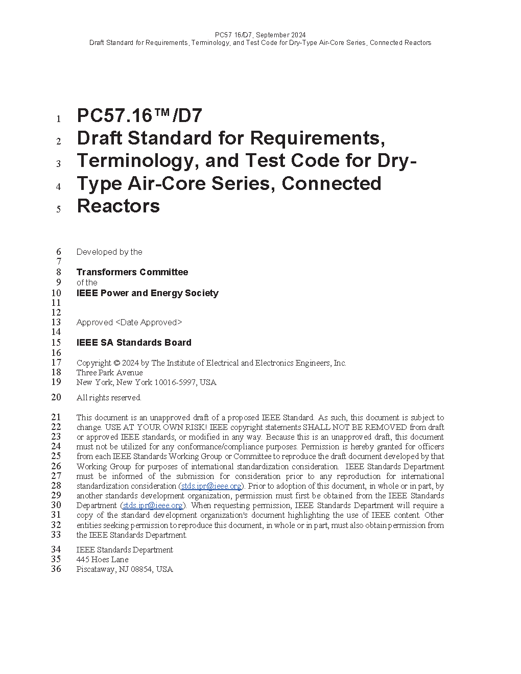The purpose of this standard is to define the requirements and test code for series-connected dry-type aircore reactors and, with some restrictions, filter reactors, shunt capacitor reactors, and discharge currentlimiting reactors.