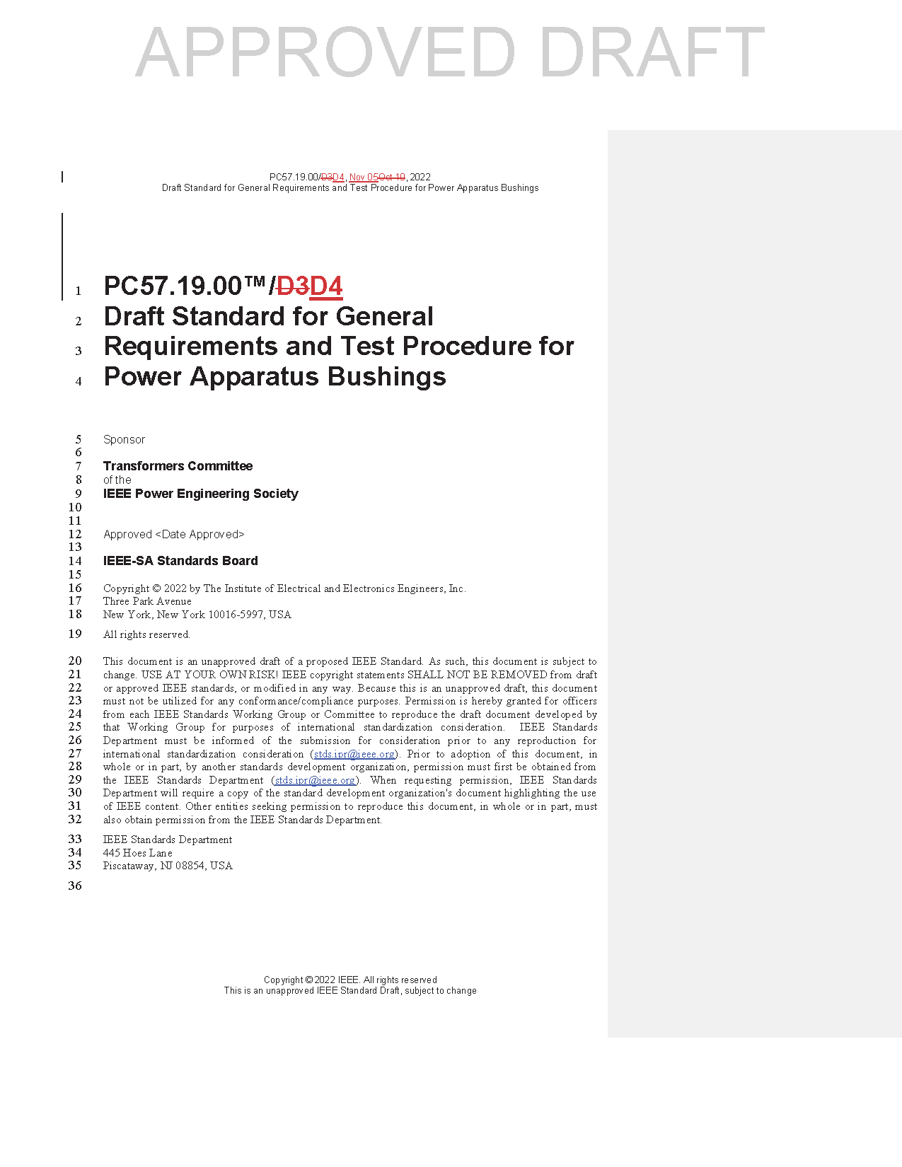 This standard defines the special terms used, service conditions, rating, general requirements, and test procedure for apparatus bushings. See IEEE Std C57.19.01™ for specific listings of values of electrical and mechanical characteristics, dimensions, and other related requirements that are defined or described in this standard.