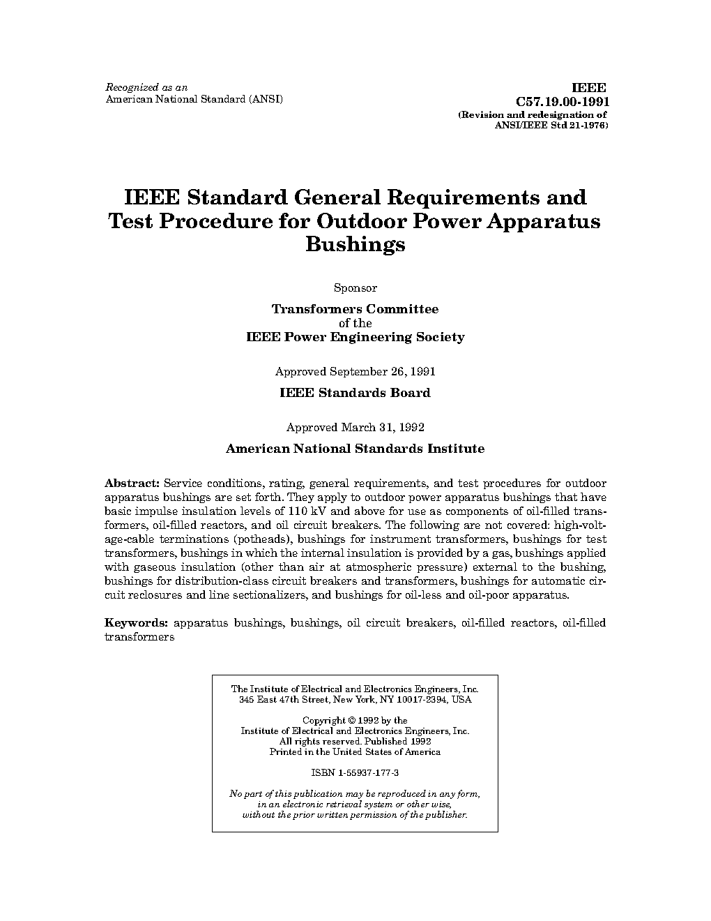 This standard applies to power apparatus bushings that have basic impulse insulation levels of 110 kV and above for use as components of oil-filled transformers and oil-filled reactors. Keywords: apparatus bushings, bushings, oil-filled reactors, oil-filled transformers