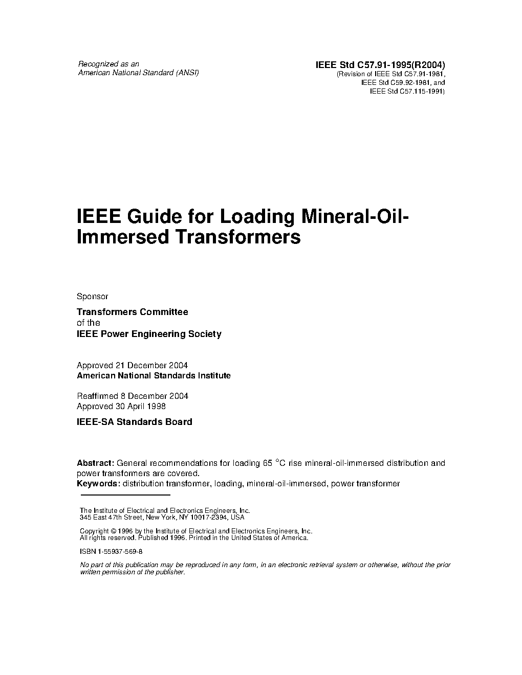 This guide covers general recommendations for loading 65 "C rise mineral-oilimmersed overhead and pad-mounted distribution transformers described in American National Standards and rated 500 kVA and less. (For transformers rated 501 kVA and larger, see ANSI/IEEE C57.92-1981, [31') Recommendations for 55 "C rise transformers are included in this guide because a substantial percentage of these transformers are still in service.