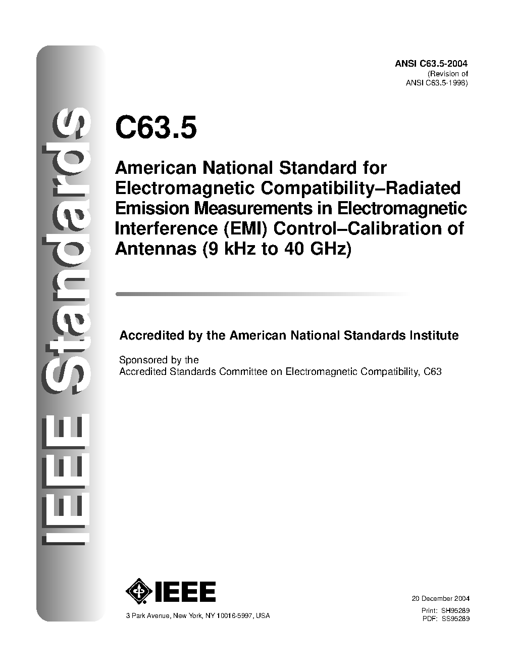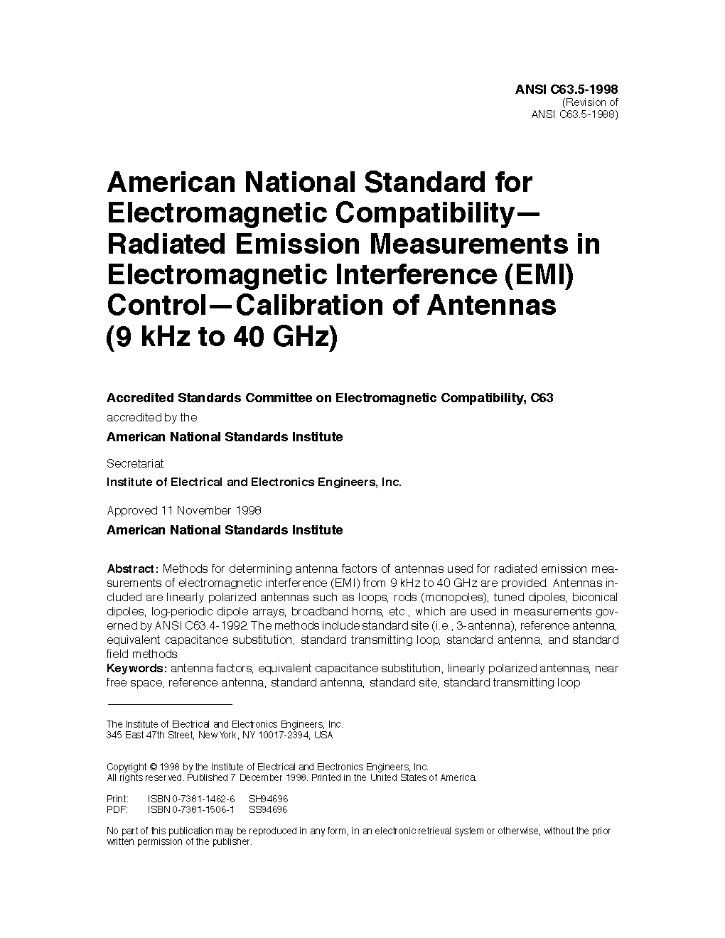 This standard provides methods for determining antenna factors of antennas used for radiated emission measurements of electromagnetic interference (EMI) from 9 kHz to 40 GHz. Antennas included are linearly polarized antennas, such as loops, rods (monopoles), tuned dipoles, biconical dipoles, log-periodic dipole arrays, hybrid linearly polarized arrays, broadband horns, etc., that are used in measurements governed by ANSI C63.4-2003. 1 The methods include standard site, reference antenna, equivalent capacitance substitution, standard transmitting loop, standard antenna, and standard field methods. The latter three methods are incorporated by reference in 4.5. Harmonization of this standard with international standards is achieved by providing one-measurement geometry in the 30 MHz to 1000 MHz frequency range. The word “shall” is used in this document to indicate mandatory requirements. The words “should” or “may” are used to indicate that among several possibilities one is strongly recommended but not mandatory.