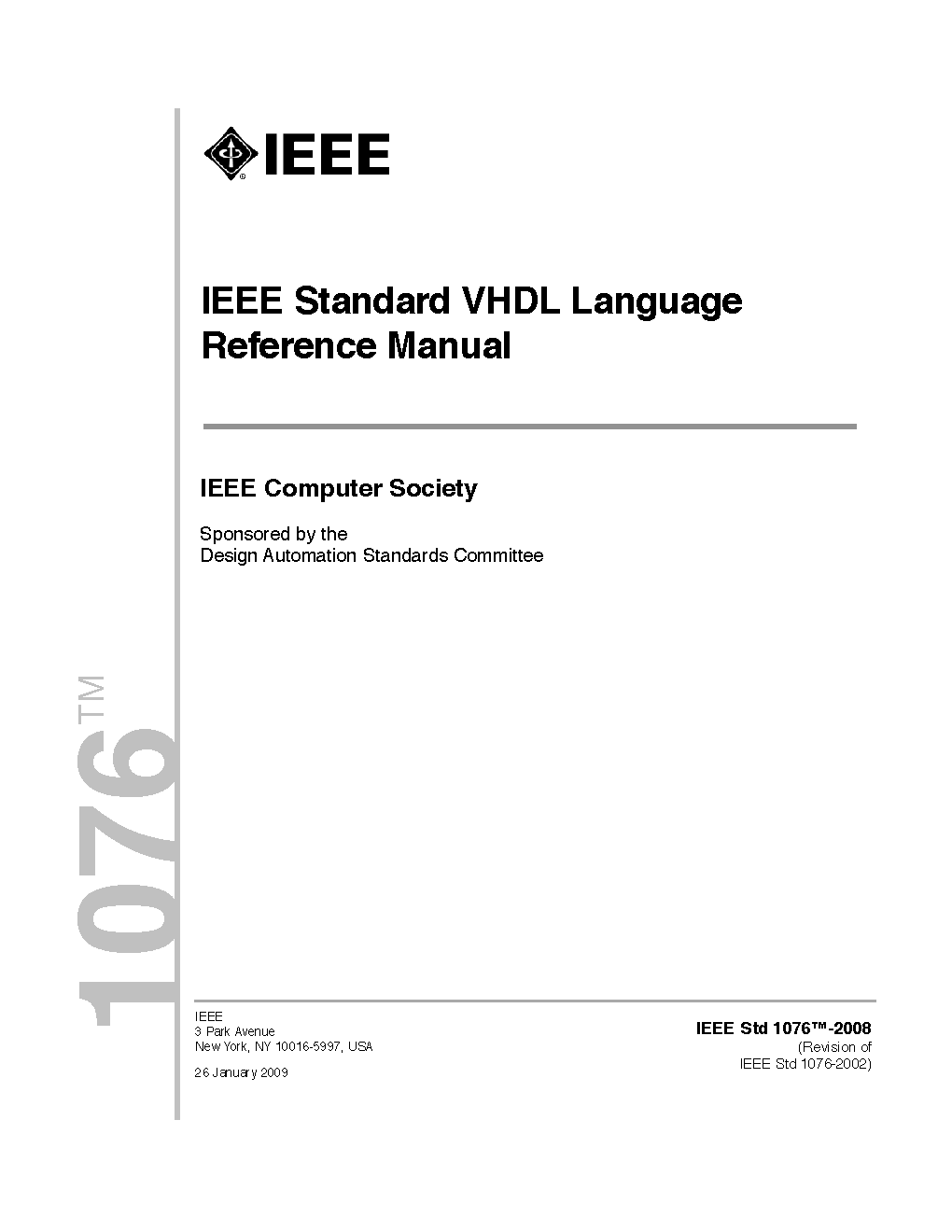 Adoption of IEEE Std 1076-2008. VHSIC Hardware Description Language (VHDL) is defined. VHDL is a formal notation intended for use in all phases of the creation of electronic systems. Because it is both machine readable and human readable, it supports the development, verification, synthesis, and testing of hardware designs; the communication of hardware design data; and the maintenance, modification, and procurement of hardware. Its primary audiences are the implementors of tools supporting the language and the advanced users of the language. (Superseded by IEEE C95.1-2019)