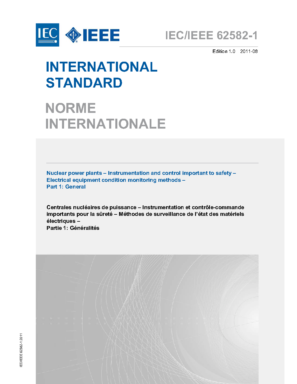 This International Standard contains requirements for application of the IEC/IEEE 62582-series of methods for condition monitoring in electrical equipment important to safety of nuclear power plants. It also includes requirements which are common to all methods. The IEC/IEEE 62582-series of standards specify condition monitoring methods in sufficient detail to enhance the accuracy and repeatability, and provide standard formats for reporting the results. The methods specified are applicable to electrical equipment containing organic or polymeric materials. Some methods are especially designed for the measurement of condition of a limited range of equipment whilst others can be applied to all types of equipment for which the organic parts are accessible. Although the scope of the standards in the IEC/IEEE 62582-series is limited to application of instrumentation and control systems important to safety, the condition monitoring methods may be applicable also to other components which include organic or polymeric materials. Standards in the IEC/IEEE 62582-series are measurement standards, primarily for use in the management of ageing in initial qualification and after installation. For technical background of condition monitoring methods, reference is made to other IEC standards, e.g. IEC 60544-5. Information on the role of condition monitoring in qualification of equipment important to safety is found in IEEE Std 323. General information on management of ageing can be found in IEC 62342 and IEEE 1205. NOTE - The procedures defined in the IEC/IEEE 62582-series are intended for detailed condition monitoring. A simplified version of the procedures may be appropriate for preliminary assessment of the need for detailed measurements.
