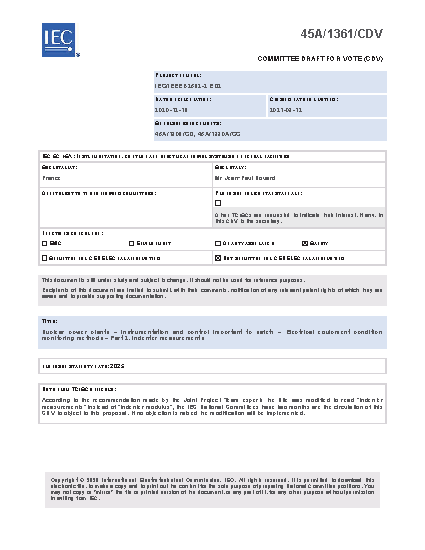 IEC/IEEE International Standard for Nuclear power plants -- Instrumentation and control important to safety -- Electrical equipment condition monitoring methods -- Part 2: Indenter modulus - Amendment 1