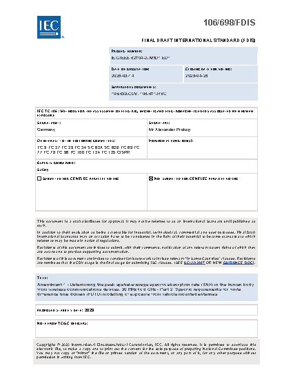 positions that are typical of persons exposed to the fields generated by vehicle mounted antennas. The extended frequency range up to 6 GHz will be considered in future revisions of this document. This document does not recommend specific peak spatial-average and whole-body average SAR limits since these are found in other documents, e.g. IEEE C95.1-2005,