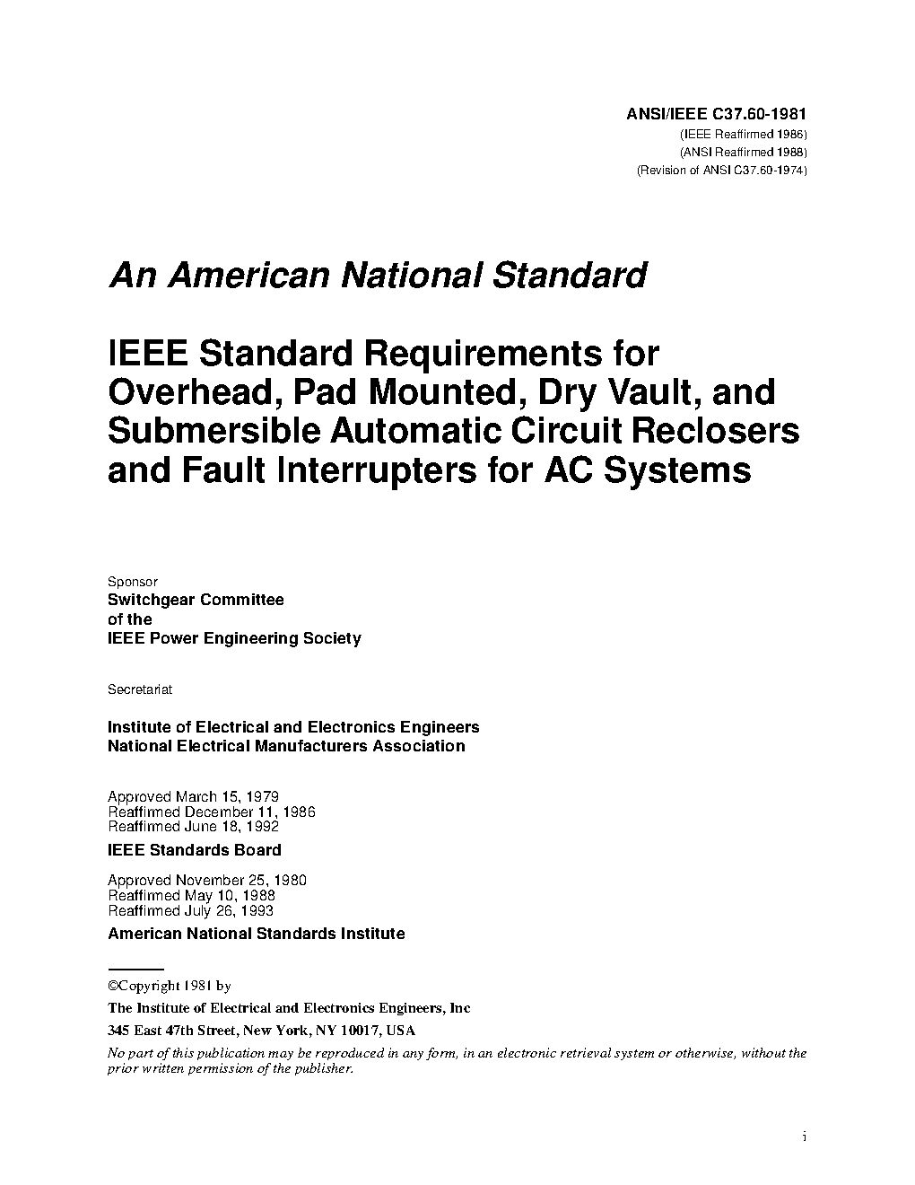 IEC/IEEE International Standard - High-voltage switchgear and controlgear - Part 111: Automatic circuit reclosers for alternating current systems up to and including 38 kV