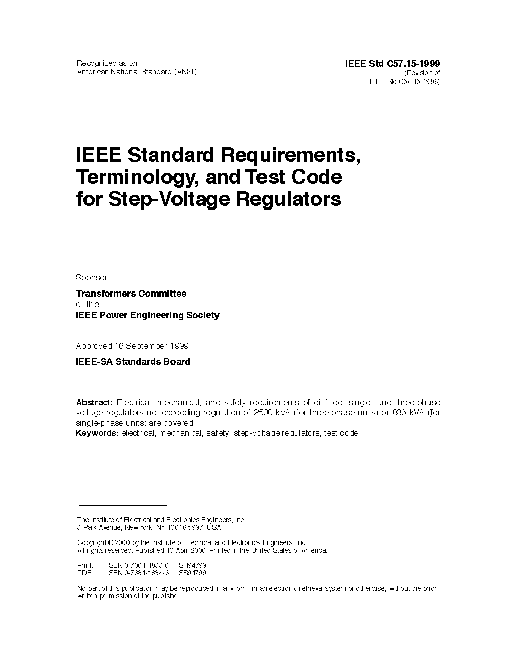 This document describes electrical, mechanical and test requirements of liquid-immersed, single- and three-phase, 50 Hz and 60 Hz, self and forced-air cooled, distribution, overhead and substation, step-voltage regulators, 1 000 kVA (single-phase units) or 3 000 kVA (threephase units) and smaller, 34 500 volts and below (2 400 V minimum) and their associated controls.