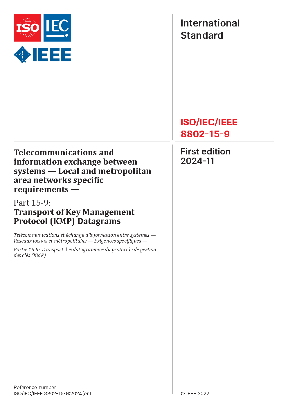 ISO/IEC/IEEE International Standard: Telecommunications and information exchange between systems--Local and metropolitan area networks specific requirements--Part 15-9: Transport of Key Management Protocol (KMP) Datagrams
