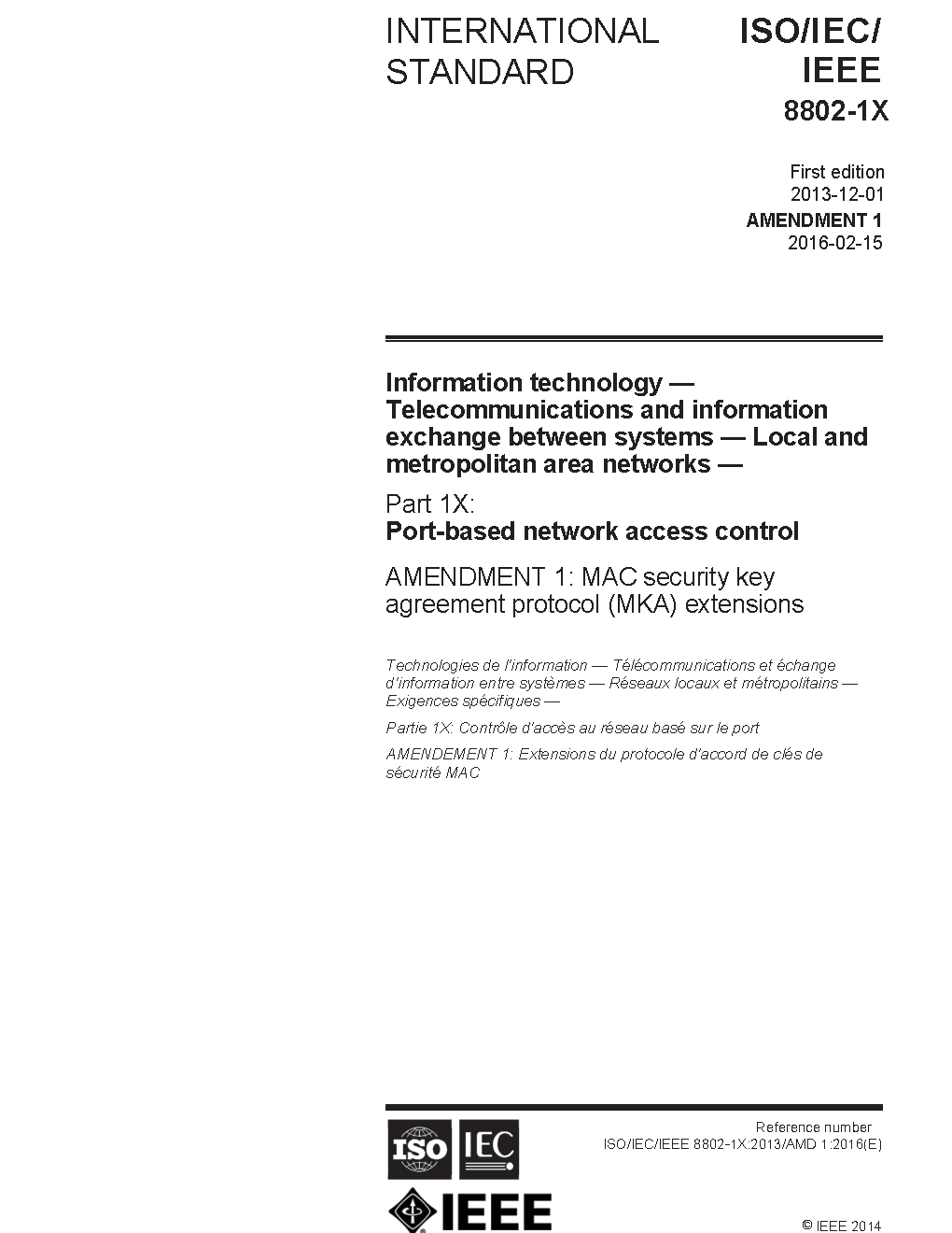 Port-based network access control allows a network administrator to restrict the use of IEEE 802(R) LAN service access points (ports) to secure communication between authenticated and authorized devices. This standard specifies a common architecture, functional elements, and protocols that support mutual authentication between the clients of ports attached to the same LAN and that secure communication between the ports, including the media access method independent protocols that are used to discover and establish the security associations used by IEEE 802.1AE(TM) MAC Security.