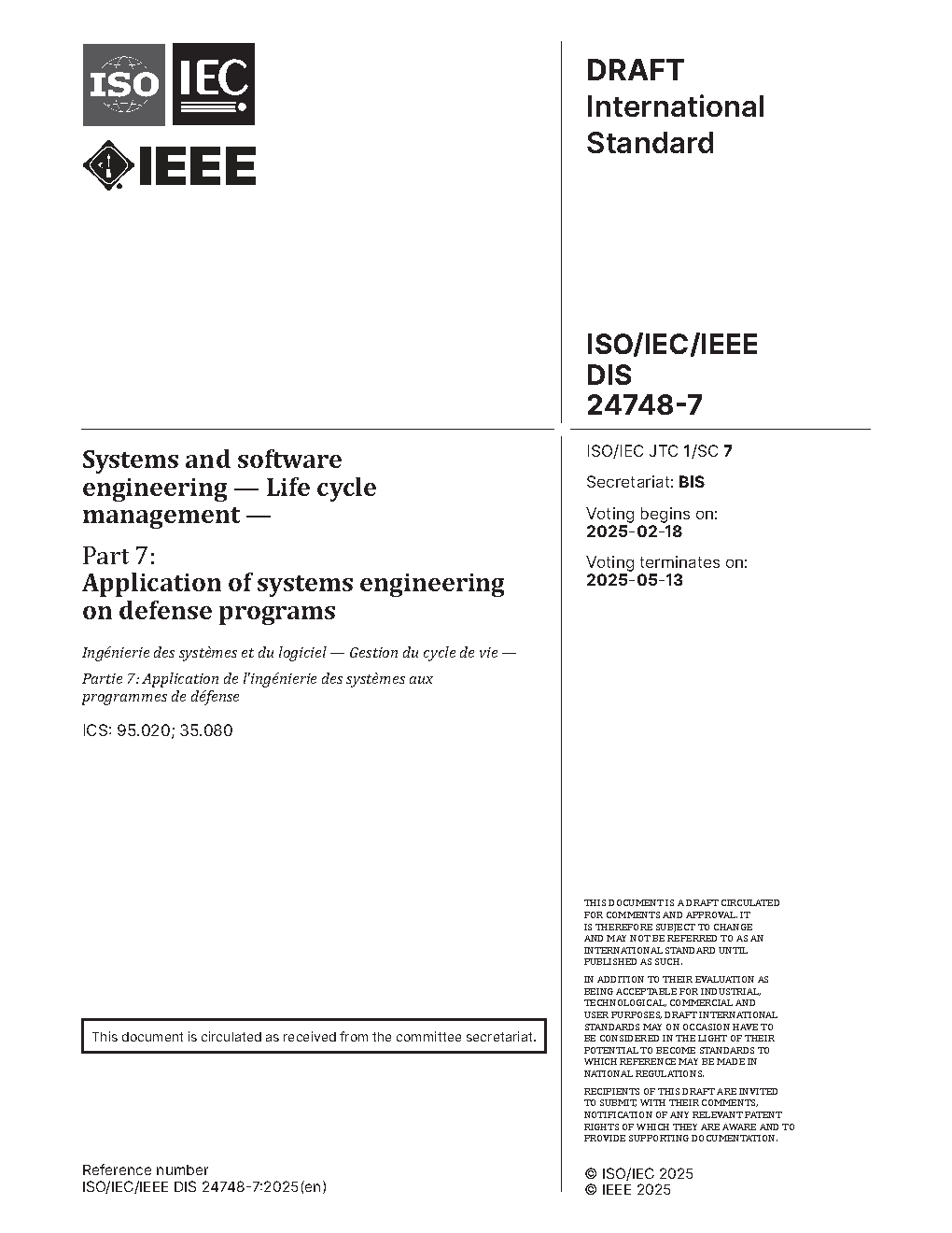 IEEE/ISO/IEEE Draft international Standard - Systems and software engineering--Life cycle management--Part 7: Application of systems engineering on defense programs