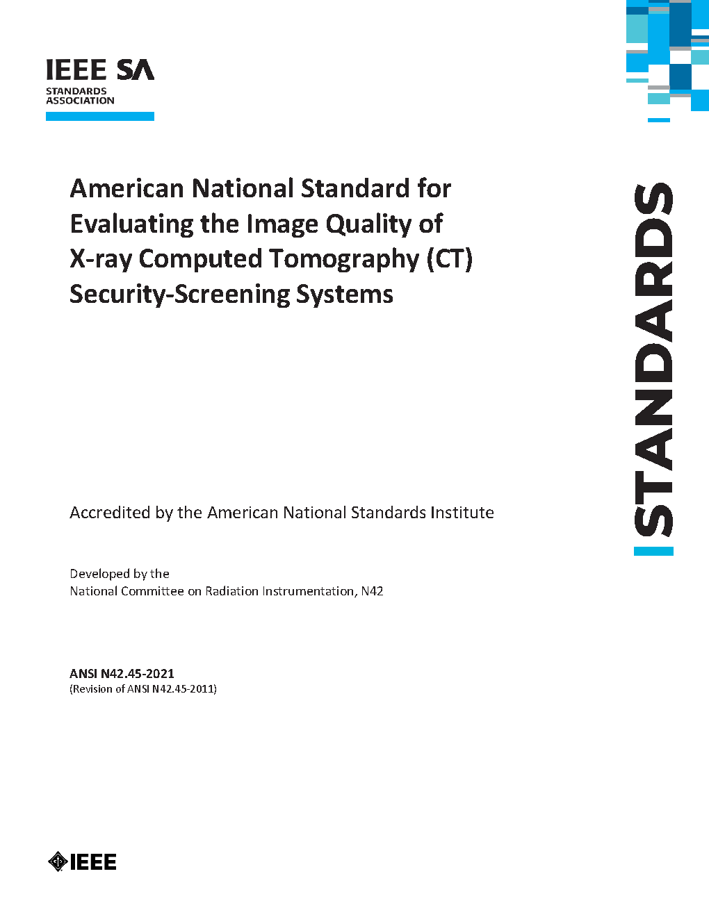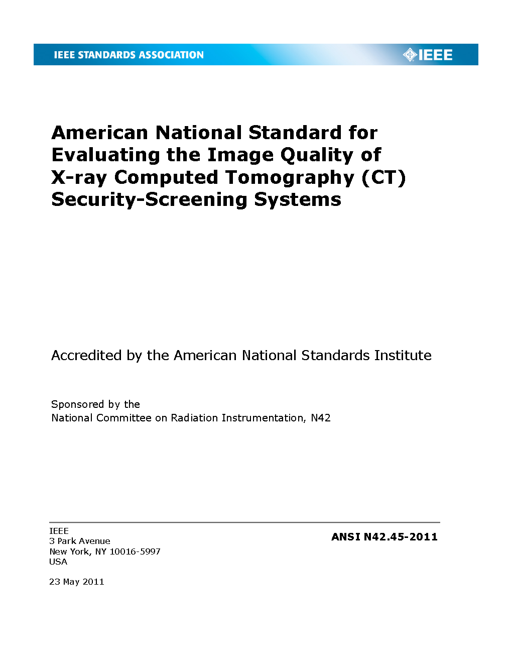 Security screening systems are generally used to scan parcels, including luggage, for the presence of illicit items such as explosives, drugs, or other contraband. Many of the screening systems currently used, particularly in transportation security applications, are based on CT imaging technology. Generally, as the parcel is transported through the system, the system collects a CT image of the parcel. These data are then subjected to automated analysis to determine whether a threat may be present or the parcel is considered clear. If the automated analysis determines a threat may be present, the image is often presented to a system operator who can override the automated decision, clearing the parcel, or referring it for further processing such as opening it and manually searching for threats. Historically, government regulators have established evaluation procedures to determine whether a system’s automated detection performance is adequate for use in applications within their borders. Typically, a vendor submits a copy of their product, including their software to the regulator’s facility. The regulator runs a wide variety of parcels with threats inside through the system as well as parcels without threats that represent the typical stream of commerce. Detection and false alarm rates are determined and compared against performance criteria. If the criteria are met, the system is approved for use. This testing assures that the system is capable of meeting the required criteria, but how does one assure that all copies of the system meet the criteria? Normal manufacturing variability, quality control issues, or aging of the equipment may degrade performance versus what was observed on the article tested by the regulator. Replicating the original test on each machine in question is impractical. Transporting the regulator’s threat set to a factory site or to locations where the machines are in use, presents significant security and in some cases safety concerns. This standard seeks to address this issue by specifying a suite of test methods that can be carried out on site without need for hazardous materials. The performance testing carried out by the regulators essentially evaluates the combination of the system’s ability to produce an image of the parcel along with its automatic analysis of that image data to reach a decision of threat or clear. The second part of this sequence, the analysis, is implemented through software. It should be noted that the regulators generally require that this software be designed so as to NOT evolve through use. The software used at all locations in the field must perform the same as the software did at the time of evaluation by the regulator. Configuration management of such software is a well known and straightforward art. Therefore, the real opportunity for performance variation comes from the imaging system that provides the data to the analysis software. If one can quantitatively validate that the quality of the image produced by the system in question is statistically equivalent to the image produced by the article evaluated by the regulator, one can be highly confident that the performance of the system in question is the same as what was approved by the regulator. Purchasers of CT systems for security screening applications are generally not CT experts. Inconsistencies in methods for measuring seemingly standard image quality values (resolution, signal-to-noise, etc.) can confuse the potential user of such CT systems. Other standards exist for testing aspects of CT image quality, particularly in the medical field. This standard specifies a set of methods to apply in assessing CT image quality geared towards security screening. An application of this standard would be in the factory acceptance testing of equipment.