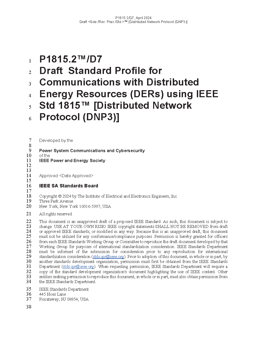 IEEE Draft Standard Profile for Communications with Distributed Energy Resources (DERs) using IEEE Std 1815 [Distributed Network Protocol (DNP3)]