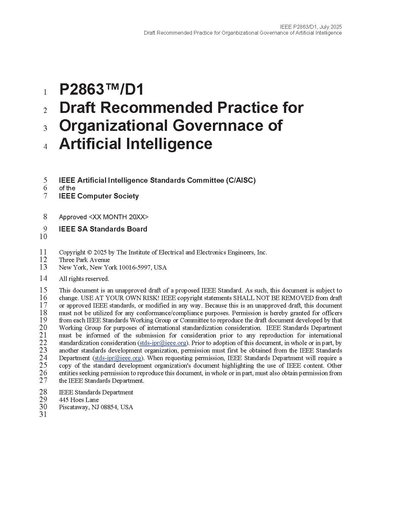IEEE Draft Recommended Practice for Organizational Governance of Artificial Intelligence
