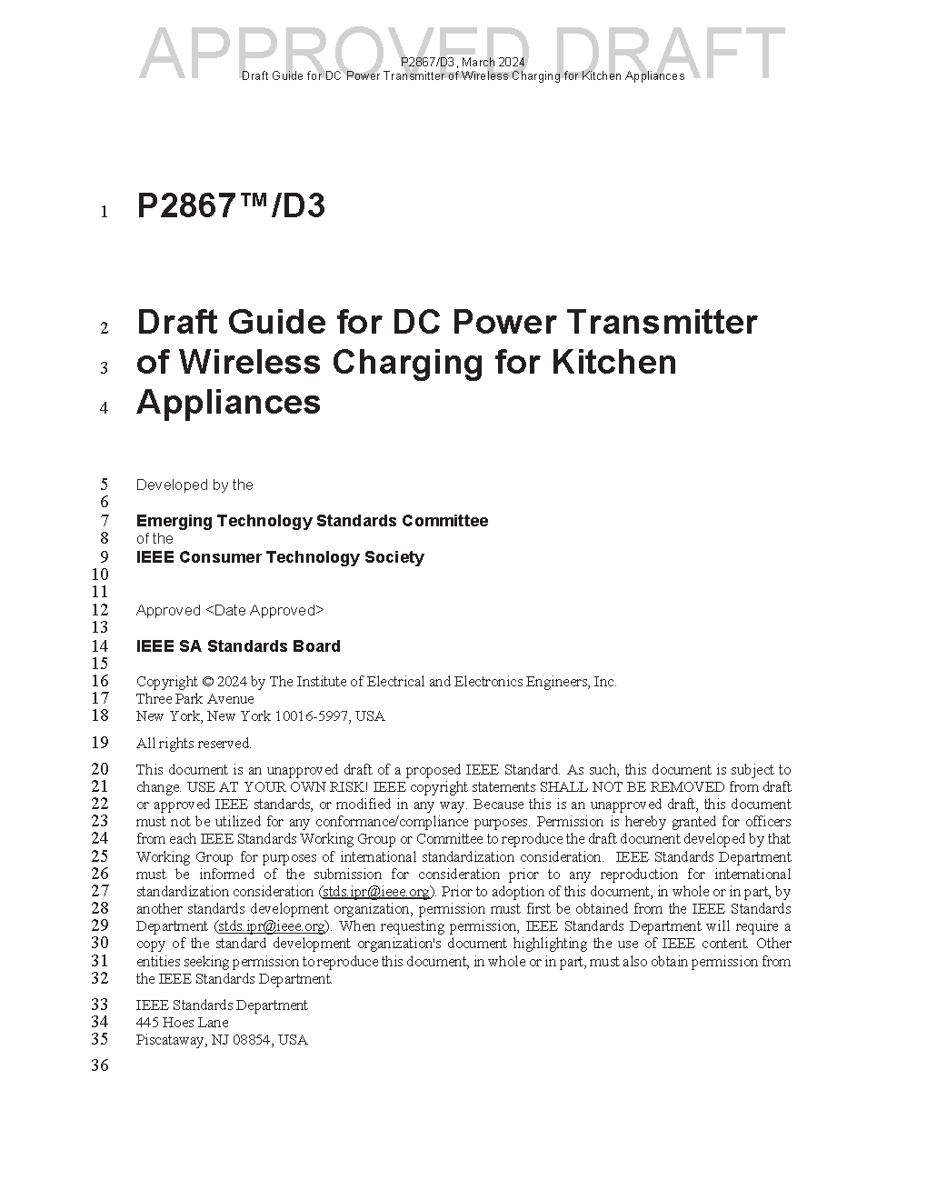 IEEE Draft Guide for Direct Current (DC) Power Transmitter of Wireless Charging for Kitchen Appliances