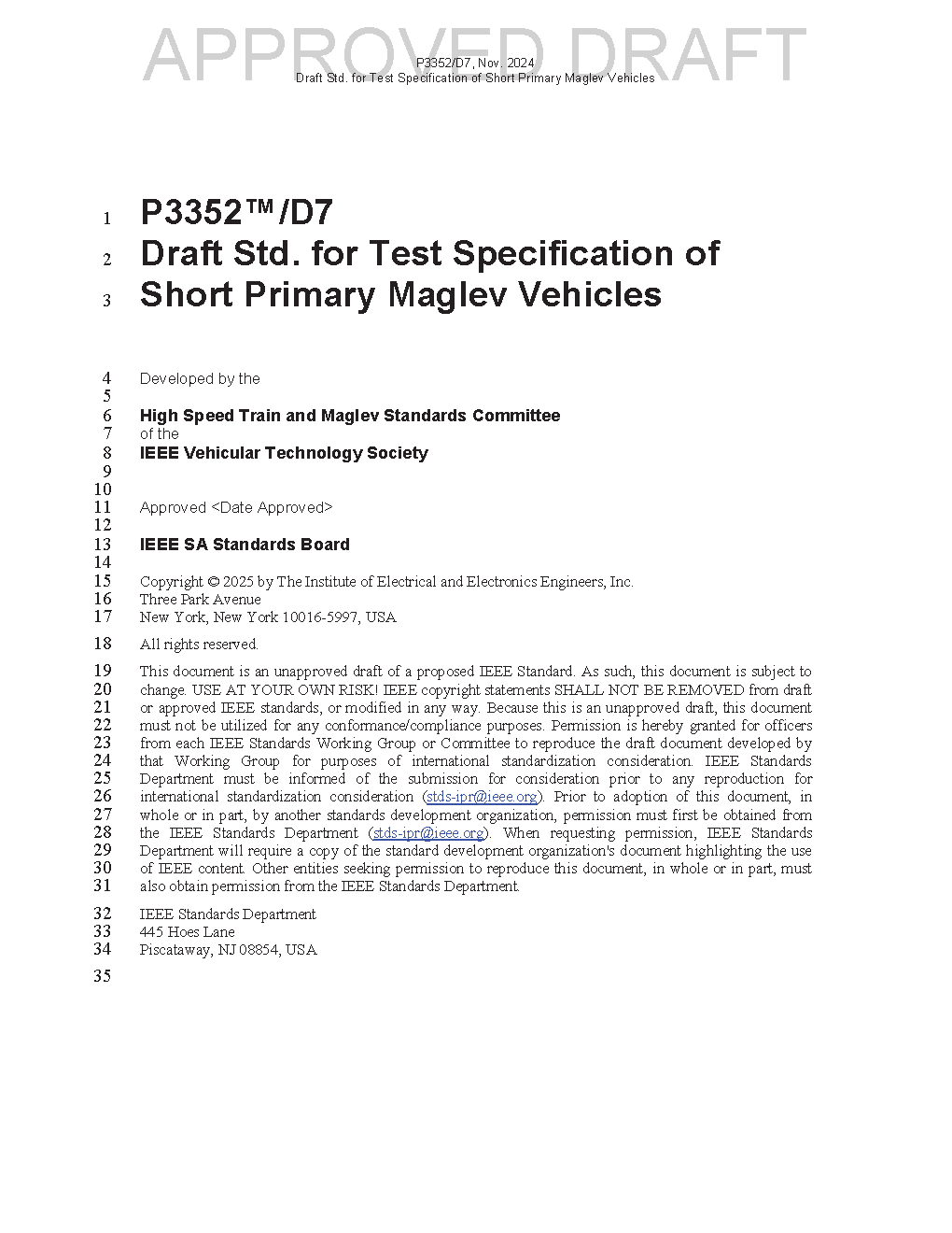 IEEE Approved Draft Standard for Test Specification of Short Primary Maglev Vehicles