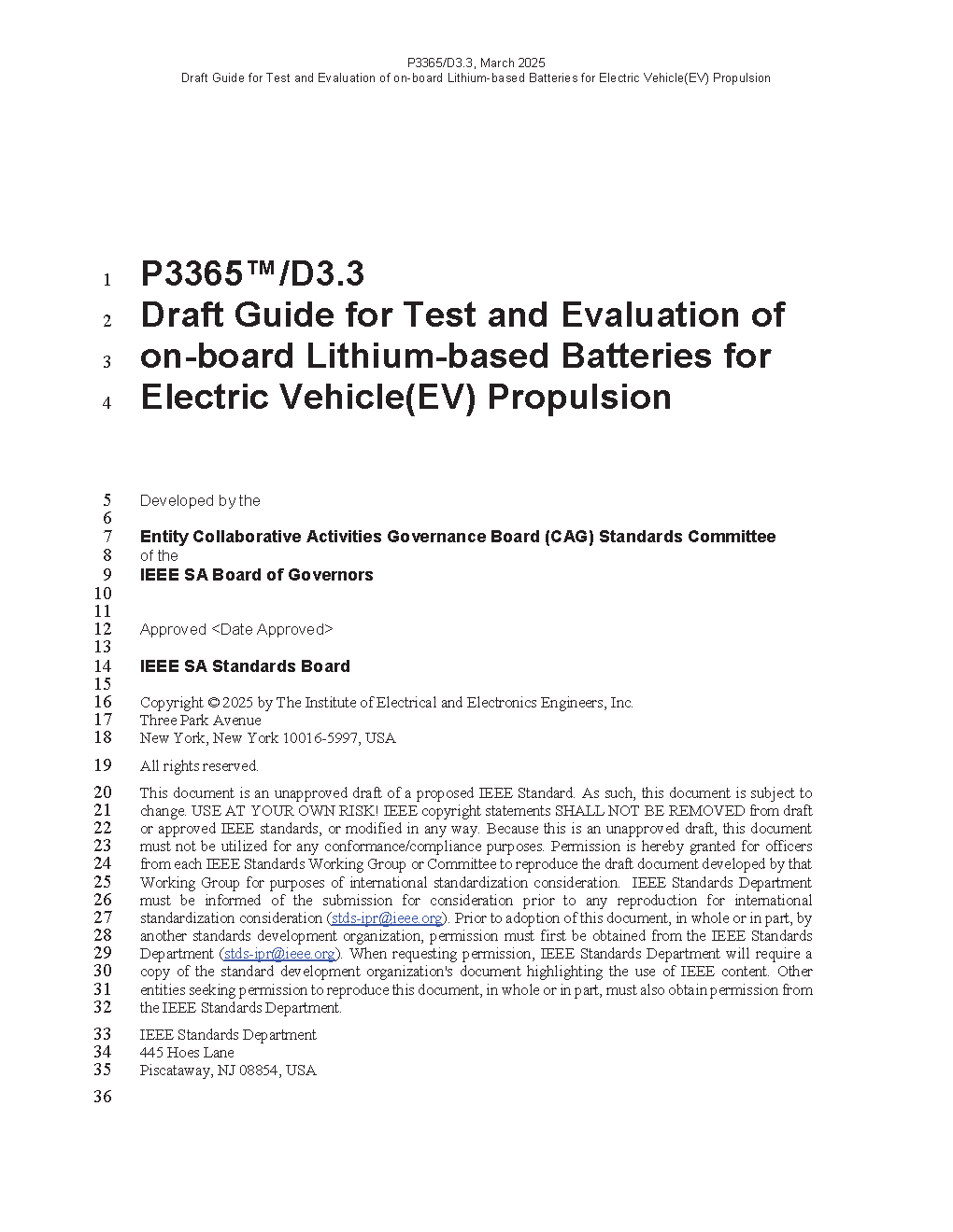IEEE Draft Guide for Test and Evaluation of on-board Lithium-based Batteries for Electric Vehicle (EV) Propulsion