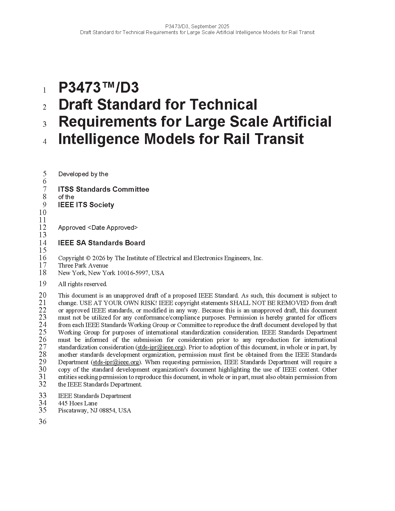 IEEE Draft Standard for Technical Requirements for Large Scale Artificial Intelligence Models for Rail Transit