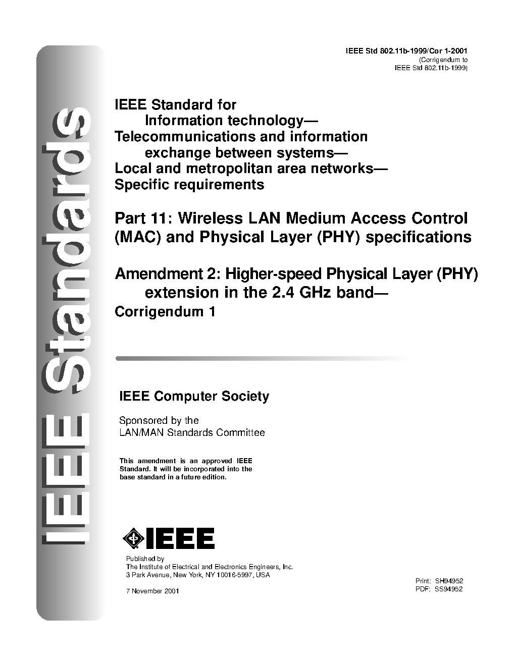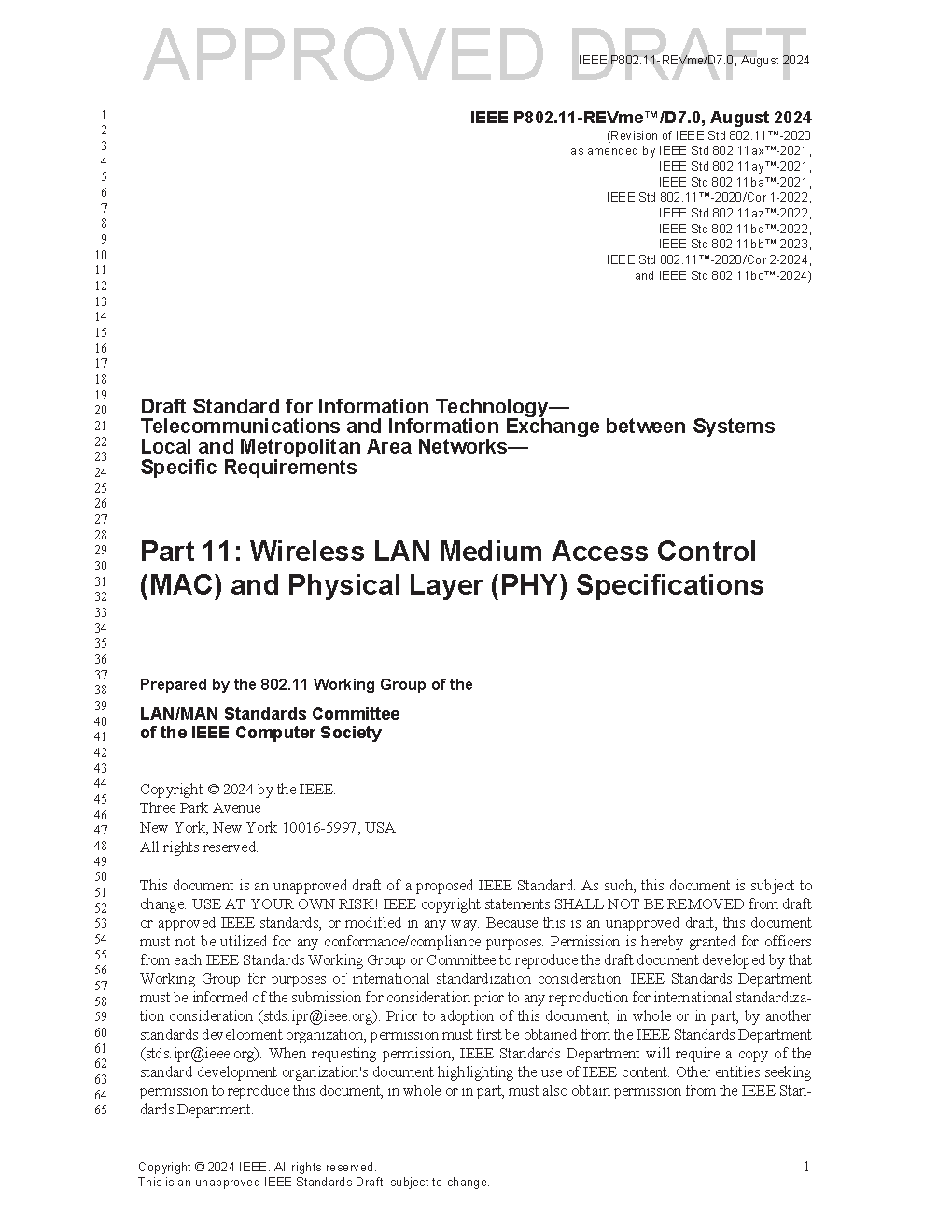A change to IEEE Std 802.11 for wireless local area networks (WLANs) that corrects an error in the number used for the information identifier (ID) for the EBCS element of the access network query protocol (ANQP). 802.11-2020/Cor 2-2024 was approved on February 15, 2024. This is included in this PDF and is not publishing as a separate document.