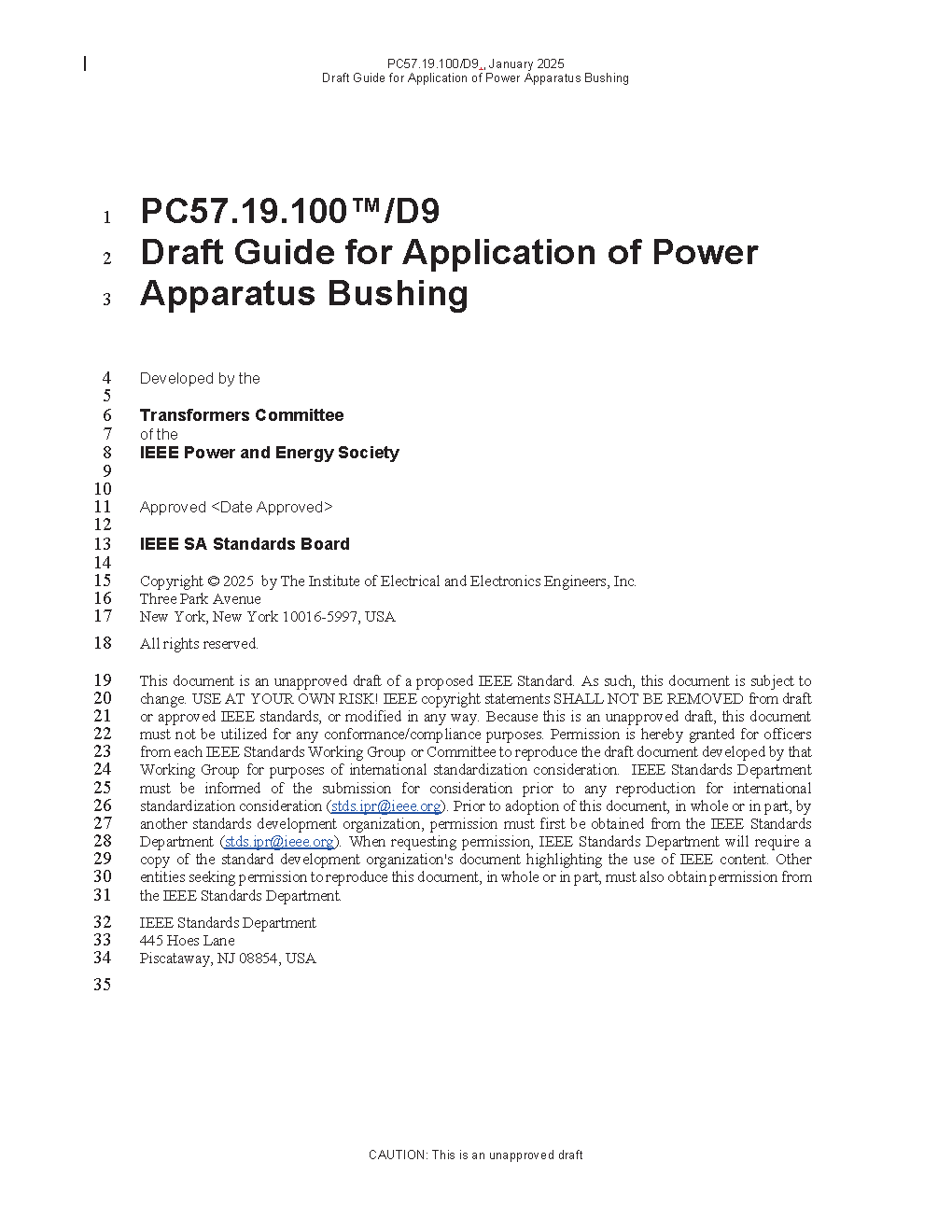 Guidance on the use of outdoor power apparatus bushings is provided in this document. The bushings are limited to those built in accordance with IEEE Std C57.19.00 with references to obsolete voltage classes and breaker bushings