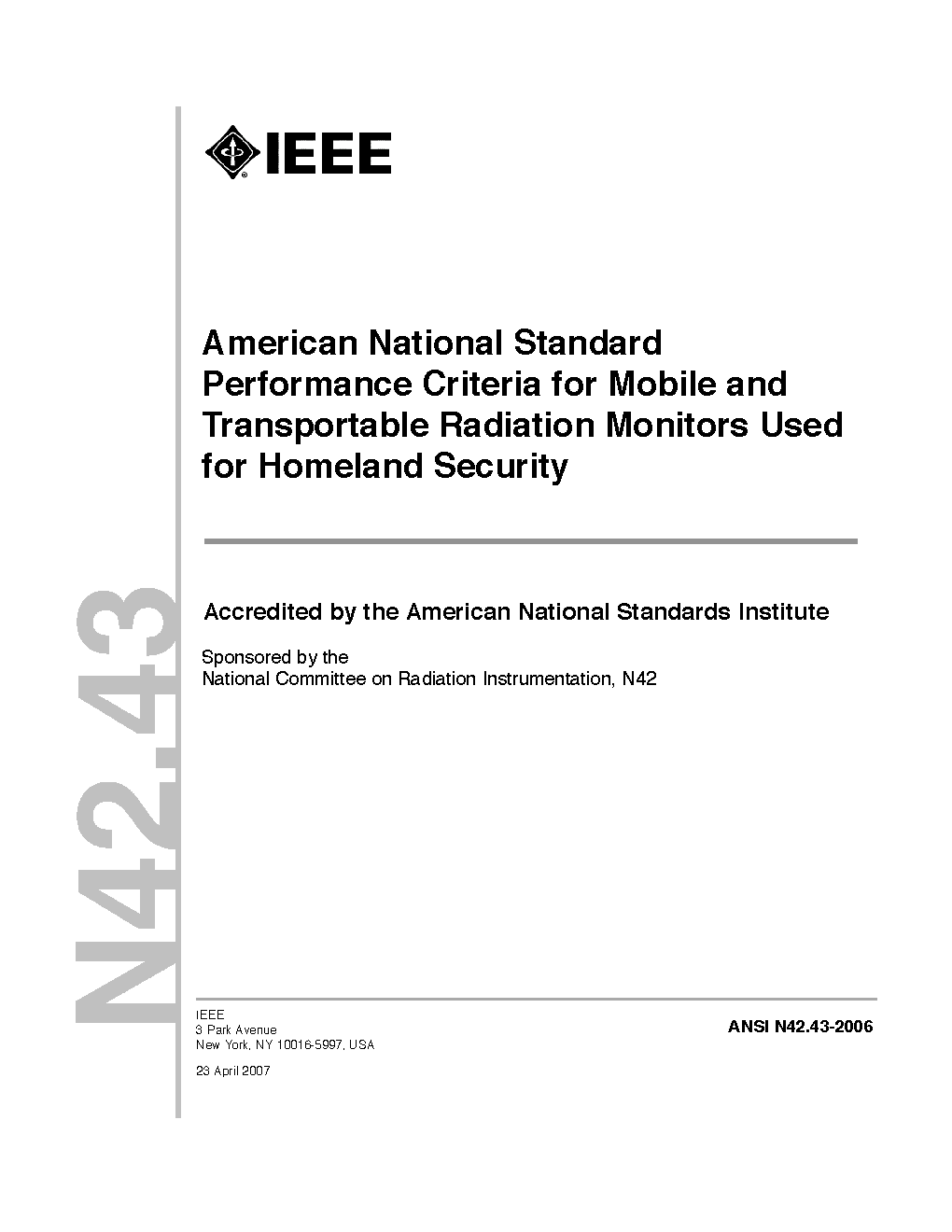 The operational and performance requirements for mobile radiation monitors (MRMs) used in homeland security applications are specified in this standard. MRMs may be operated while in motion or while in a fixed location.