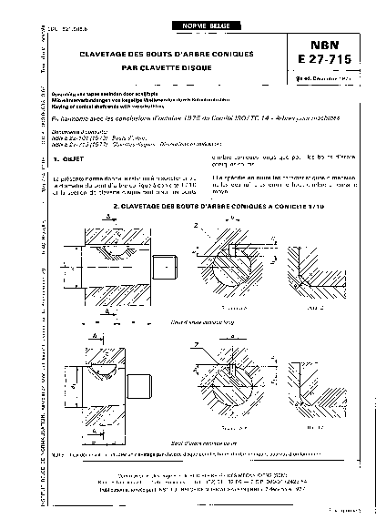 La présente norme donne la relation à respecter entre le diamète du bout d'arbre conique à conicité 1/10 et la section de clavette disque tant pour les bouts d'arbre coniques longs que pour les bouts d'arbre coniques courts.