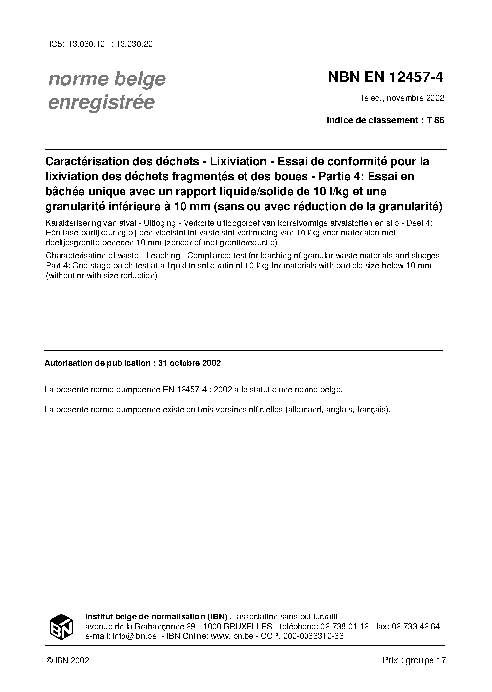 This part of the European Standard specifies a compliance test providing information on leaching of granular wastes and sludges under the experimental conditions specified hereafter, and particularly a liquid to solid ratio of 10 l/kg dry matter. It applies to waste which has a particle size below 10 mm without or with limited size reduction. Note: In some cases, it could be useful to test the material with coarser particles up to 40 mm in diameter: This requires a larger amount for material and liquid.