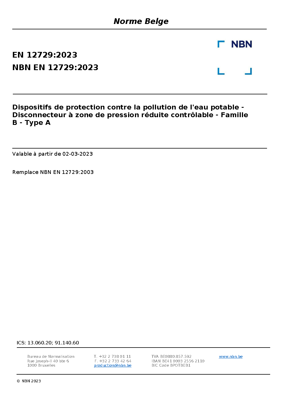 The purpose of this standard is to define - the field of application; - the dimensional, physico-chemical, design, hydraulic, mechanical and acoustic characteristics; - the working and the prescriptions for the tests to check , these characteristics; - the marking and the presentation. To be adhered to for reduced pressure principle backflow preventers, controllable BA.