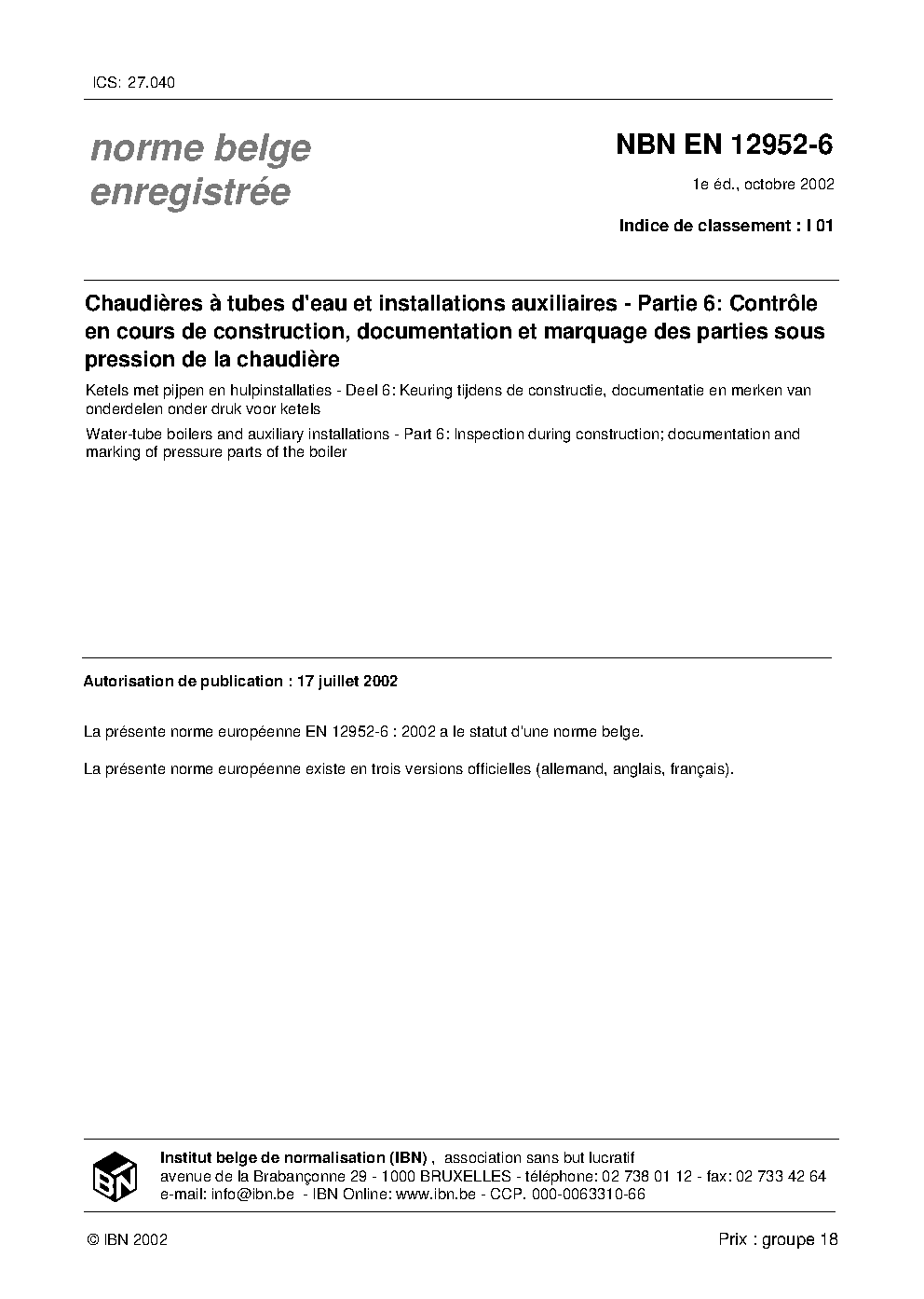 | Publisher | Bureau de Normalisation Belge (NBN) |