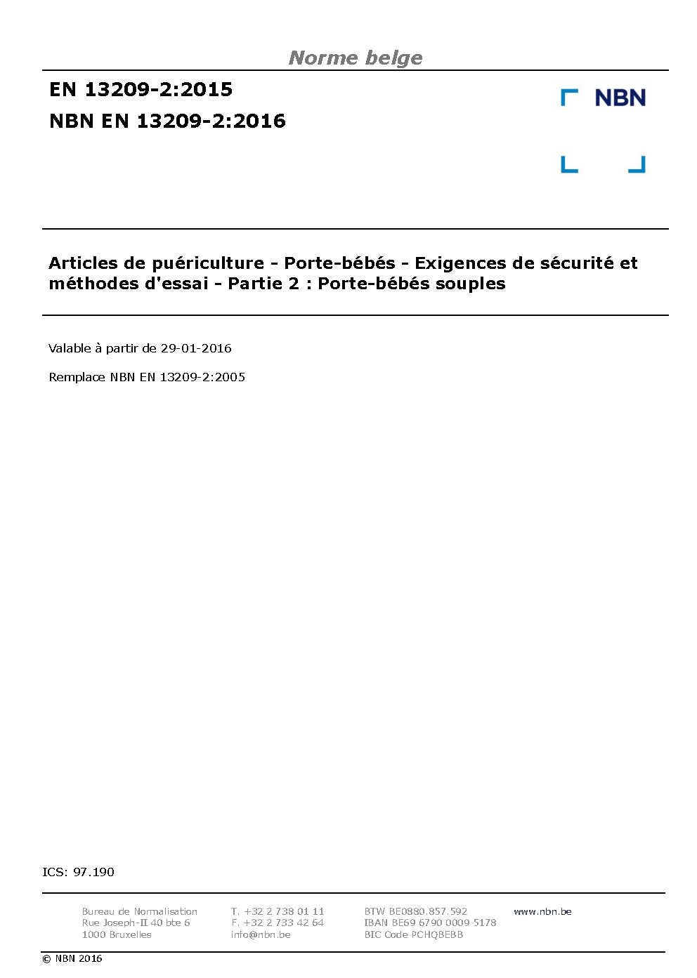 This European Standard specifies the safety requirements and test methods for soft carriers without a framed support incorporating integral leg openings designed to carry a child when attached to the carer’s torso.