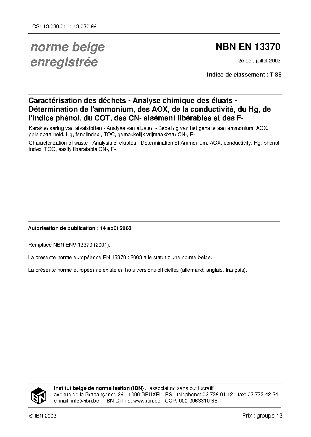| Publisher | Bureau de Normalisation Belge (NBN) |