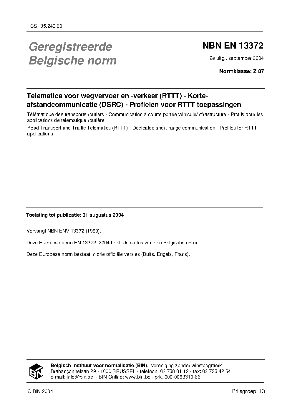 | Publisher | Bureau de Normalisation Belge (NBN) |