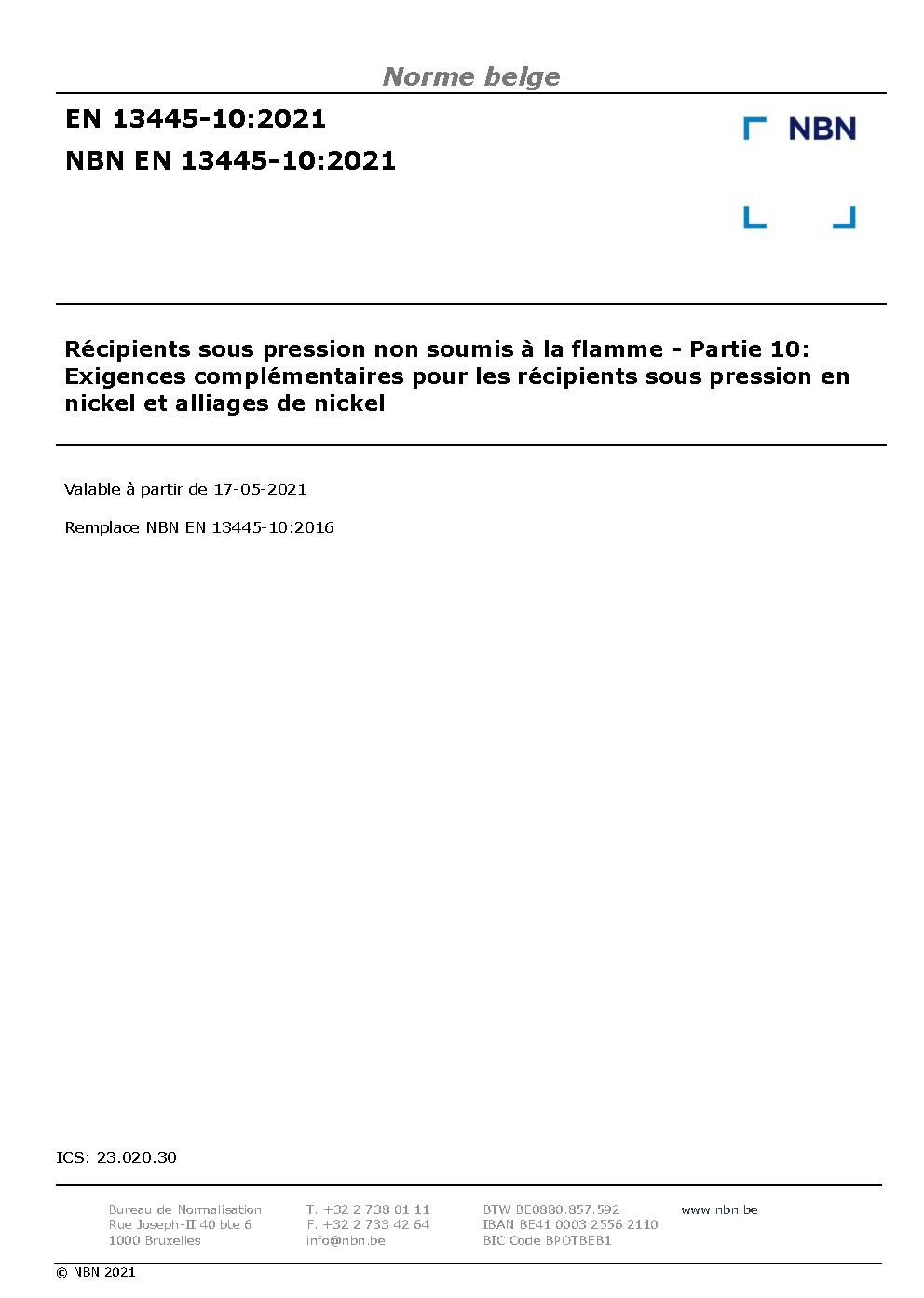 This Part 10 of this document specifies requirements for unfired pressure vessels and their parts made of nickel and nickel alloys (see 3.1) in addition to the general requirements for unfired pressure vessels under EN 13445-1:2019, EN 13445-2:2019, EN 13445-3:2019, EN 13445-4:2019 and EN 13445-5:2019.