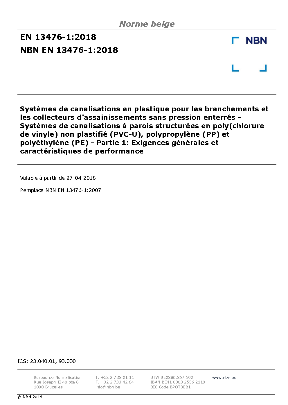 This standard, together with EN 13476 2 and EN 13476 3, covers a range of pipe and fitting sizes, materials, pipe constructions, stiffness classes and tolerance classes and offers recommendations concerning colours.