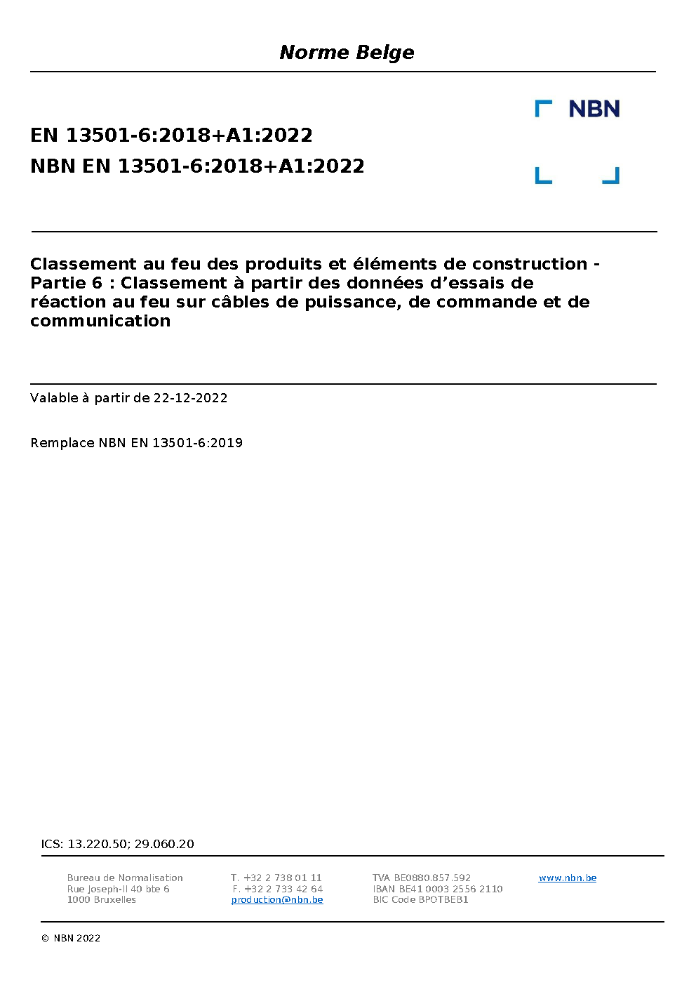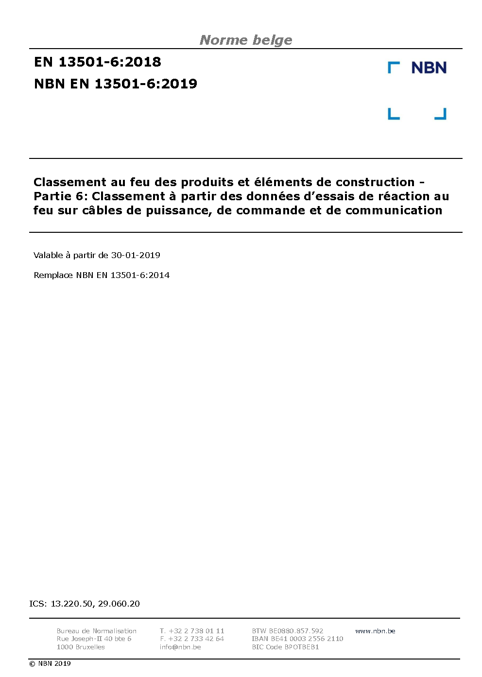 Fire classification of construction products and building elements - Part 6: Classification using data from reaction to fire tests on power, control and communication cables