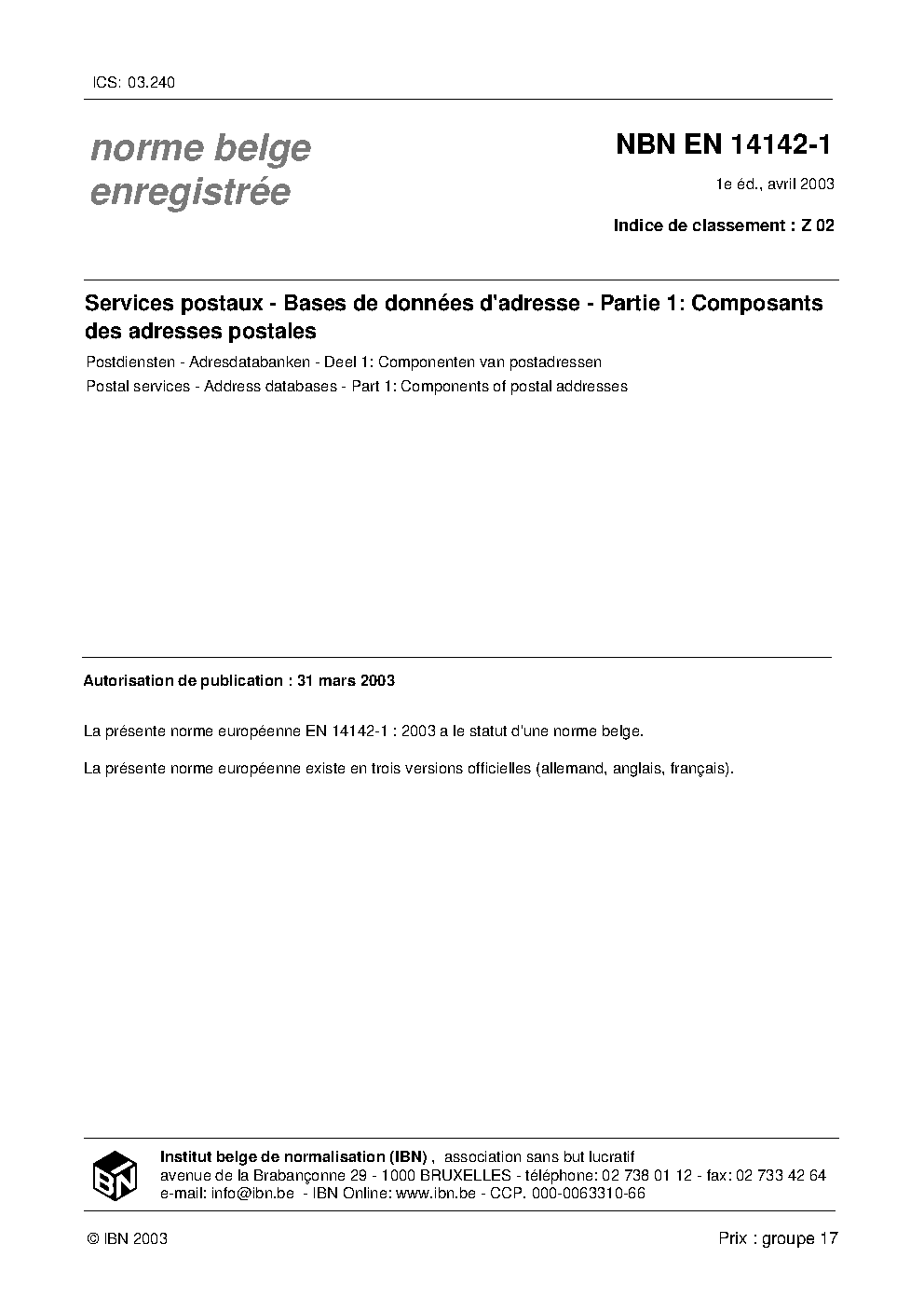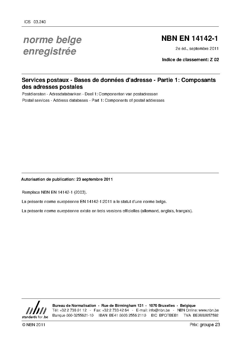 | Publisher | Bureau de Normalisation Belge (NBN) |