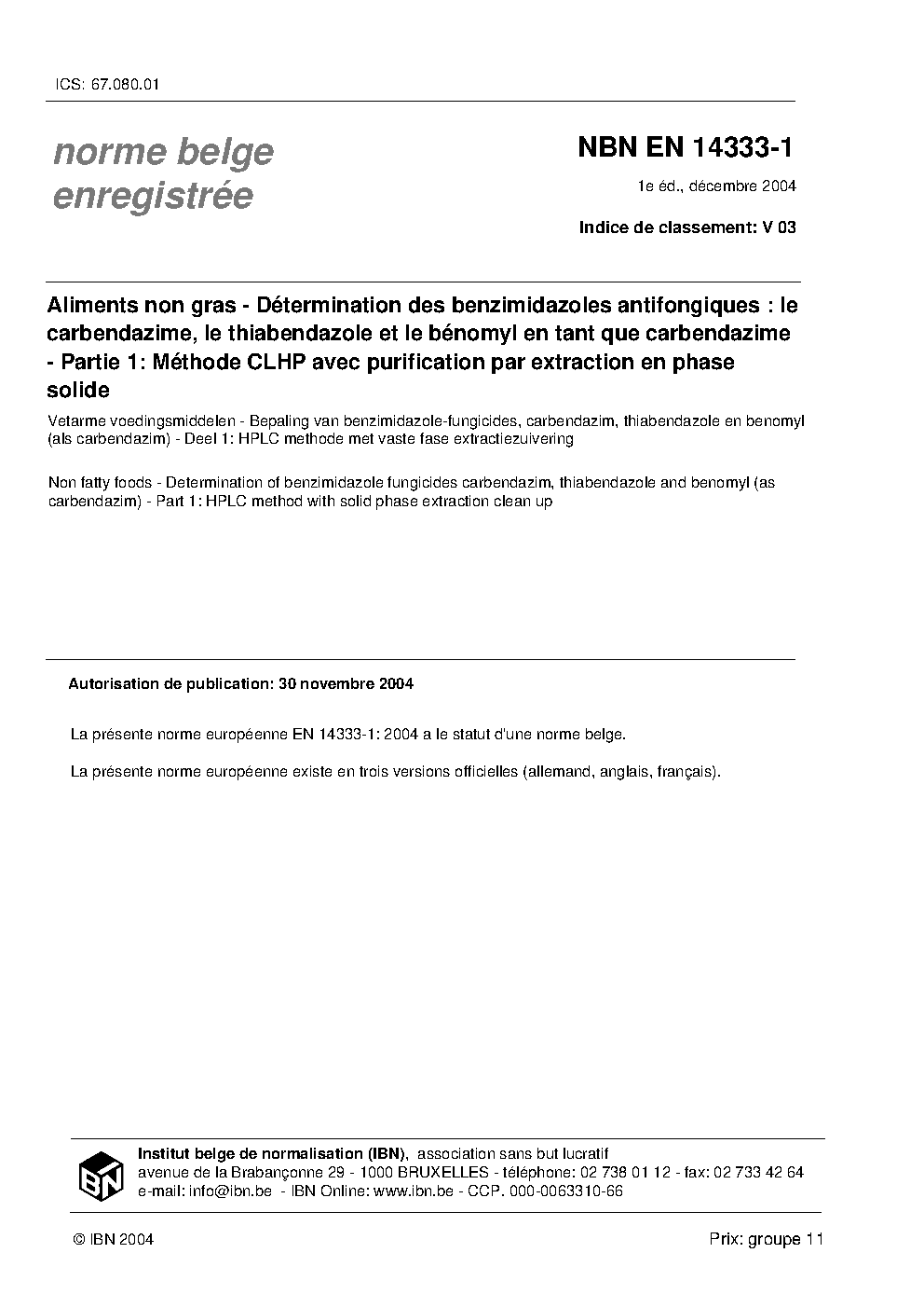 Non fatty foods - Determination of benzimidazole fungicides carbendazim, thiabendazole and benomyl (as carbendazim) - Part 1: HPLC method with solid phase extraction clean up