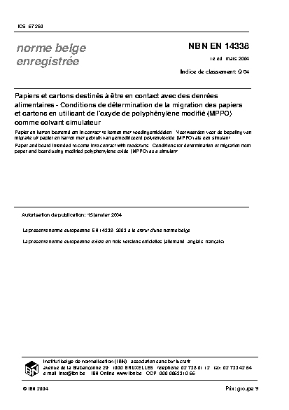 This European Standard specifies a method to assess the transfer or migration of specific volatile and semivolatile substances from paper and board. This test method is developed for paper and board intended to come in contact with dry, non fatty foodstuffs and paper and board for baking purposes. In the last case the modified polyphenylenoxide (MPPO) can be seen as a substitute simulant for fatty contact.