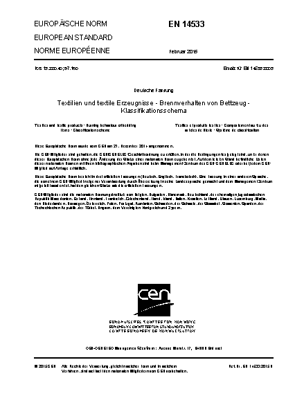 This European standard specifies a classification scheme for the burning behaviour of bedding items based on two ignition sources (smouldering cigarette and small open flame).