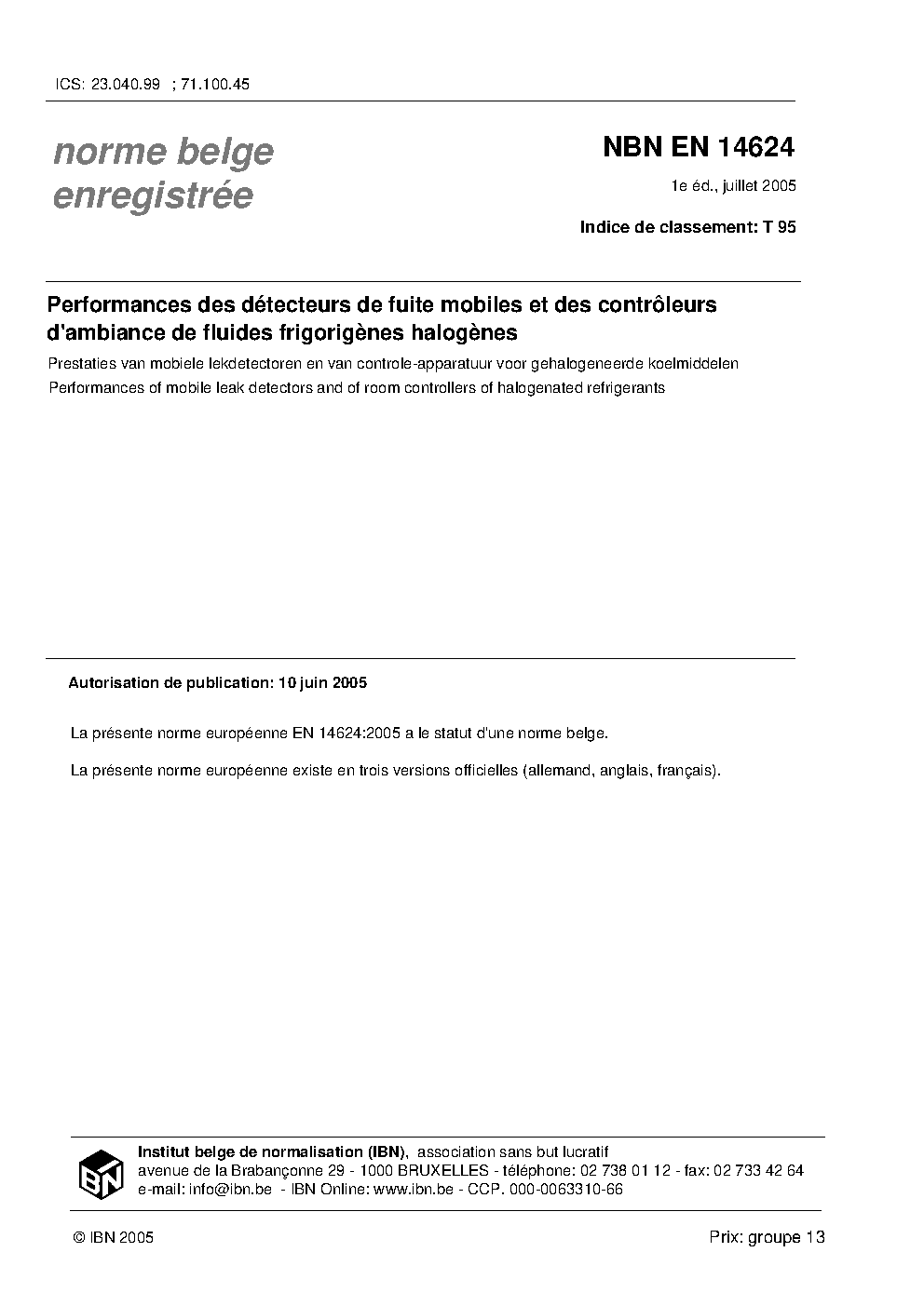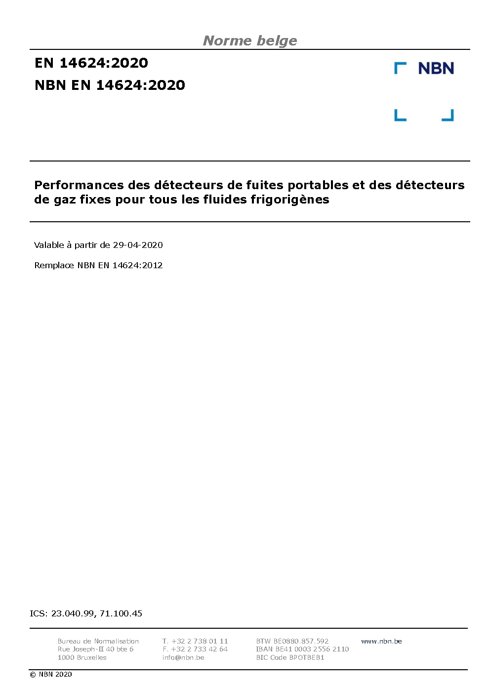The purpose of this document is to qualify performances of leak detectors or room controllers of halogenated re-frigerants. These leak detectors are designed for the detection of CFC, HCFC, HFC and PFC halogenated gases, and their sensitivity is checked with a calibrated leak.
