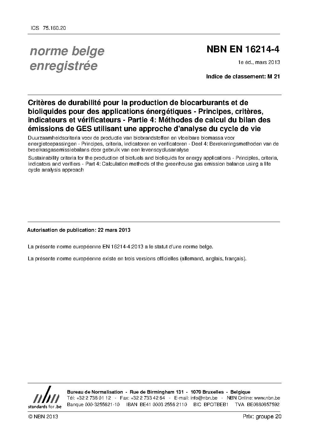 This European Standard specifies a detailed methodology that will allow any economic operator in a biofuel or bioliquid chain to calculate the actual GHG emissions associated with its operations in a standardised and transparent manner, taking all materially relevant aspects into account. It includes all steps of the chain from biomass production to the end transport and distribution operations.