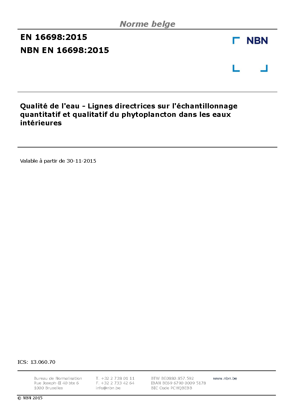 This European Standard gives guidance for sampling of phytoplankton for qualitative and quantitative limnological investigations and monitoring of water quality, e.g. ecological status.